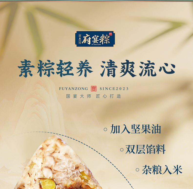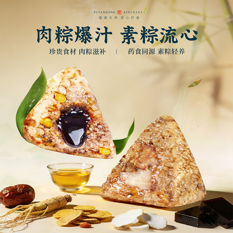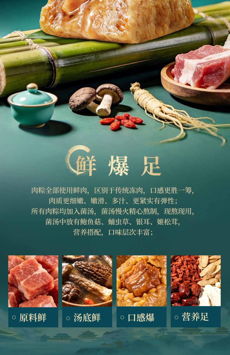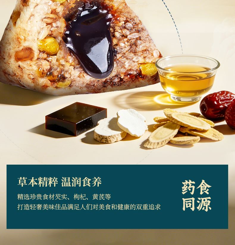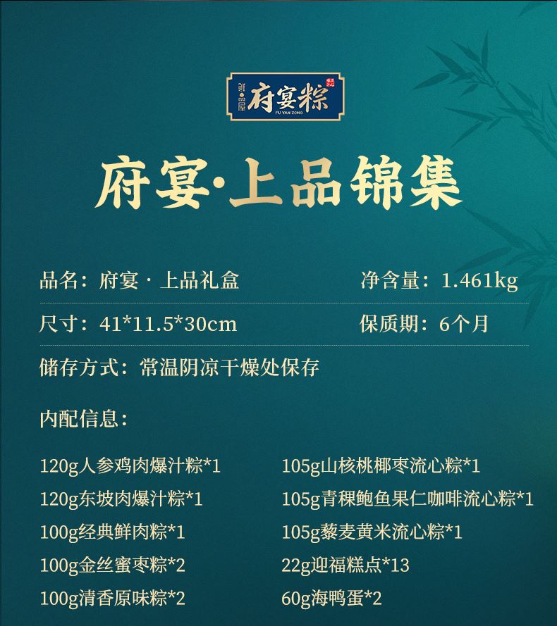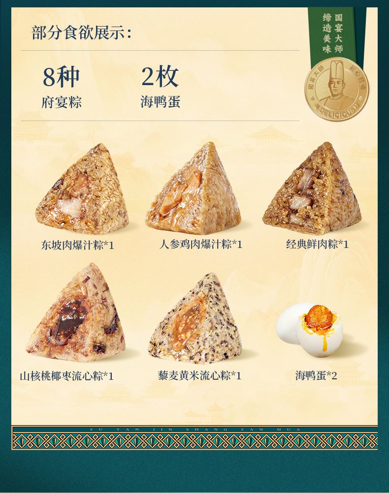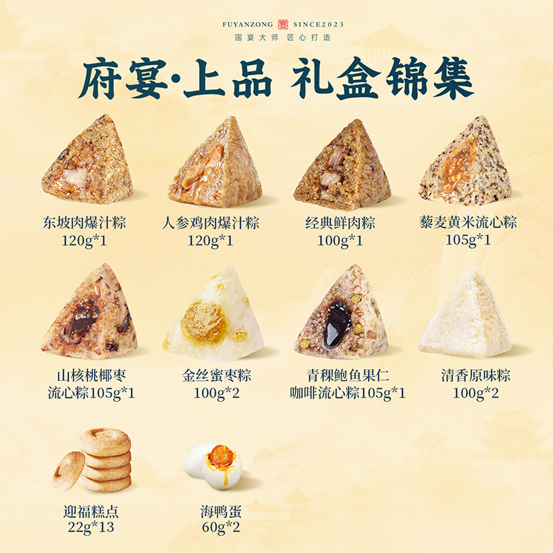 120g人参鸡肉爆汁粽*1 120g东坡肉爆汁粽*1 100g经典鲜肉粽*1 100g金丝蜜枣粽*2 100g清香原味粽*2 105g山核桃椰枣流心粽*1 105g青稞鲍鱼果仁咖啡流心粽*1 105g藜麦黄米流心粽*1 22g迎福糕点*13 60g海鸭蛋*2