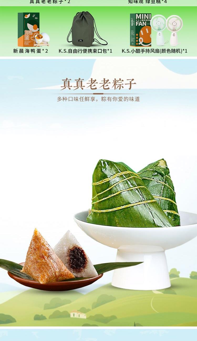 套装选用真真老老经典粽子搭配海鸭蛋、知味观绿豆糕+束口包、手持风扇,趣味实用两不误。
