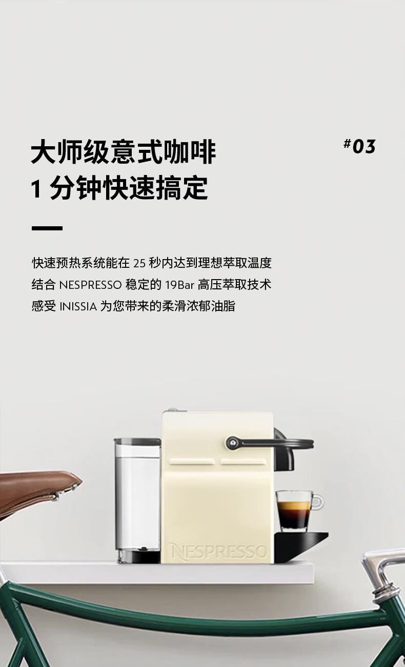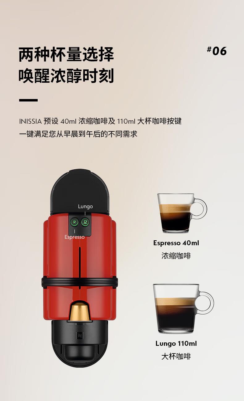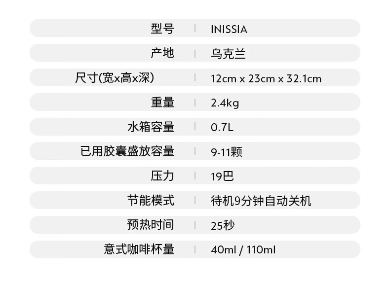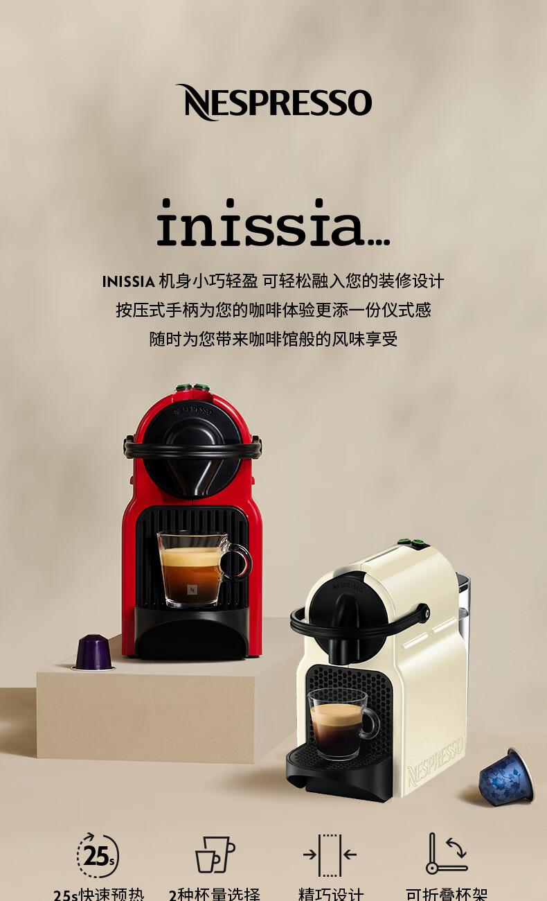 认证型号:C40 电源线长:1.2m 额定电压:220V 额定功率:1500W 产品尺寸:长321mm 宽120mm 高230mm 水箱容量:0.6-1.29L 泵浦压力:19Bar 制作口味:卡布奇诺 拿铁 意式浓缩 19Bar高压萃取系统为完整释放与呈现咖啡中的芬芳而设计;快速预热系统能在25秒内达到理想萃取温度结合NESPRESSO稳定的19Bar高压萃取技术感受INISSIA为您带来的柔滑浓郁油脂