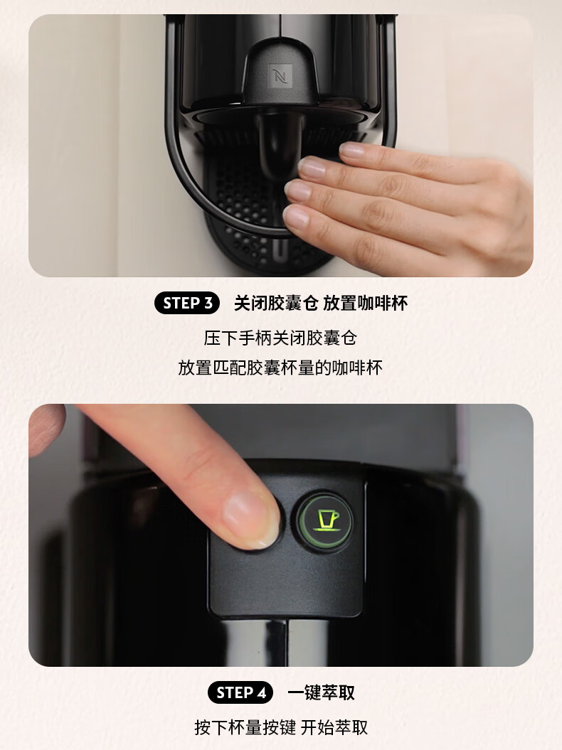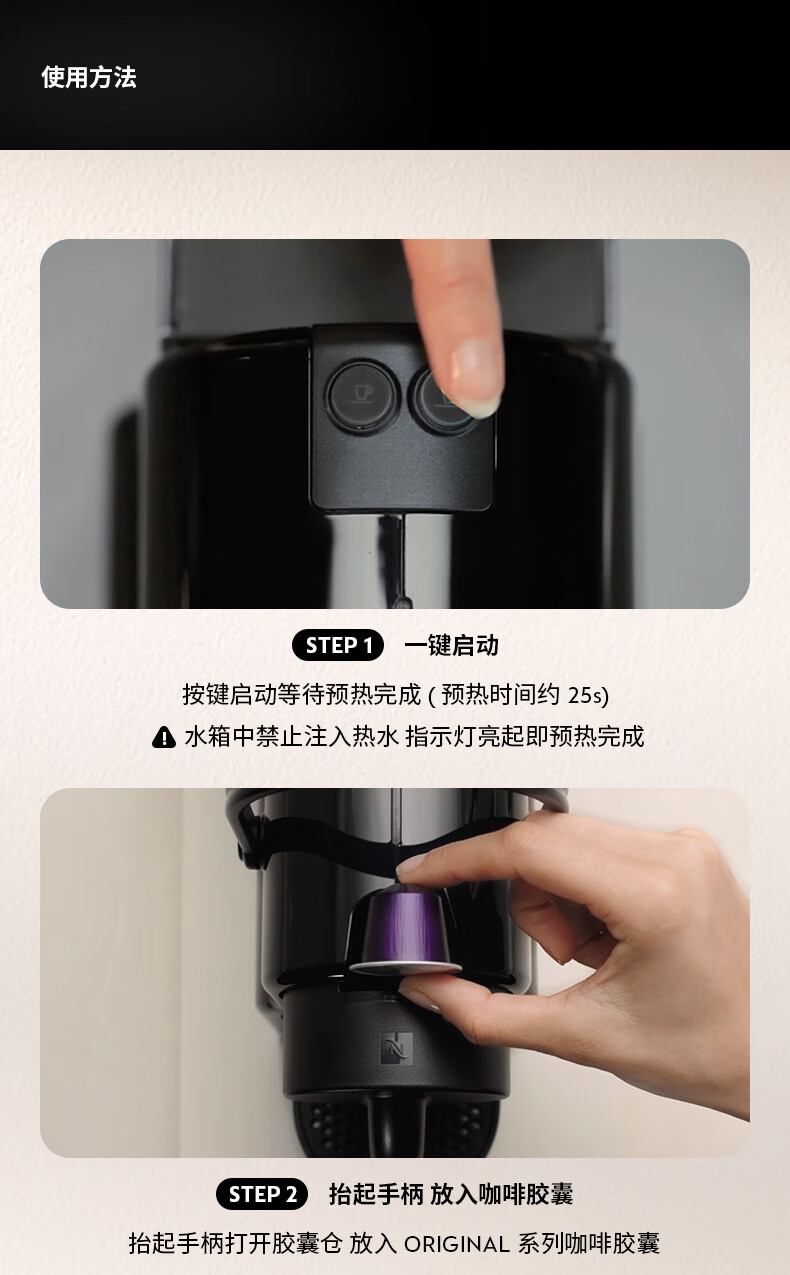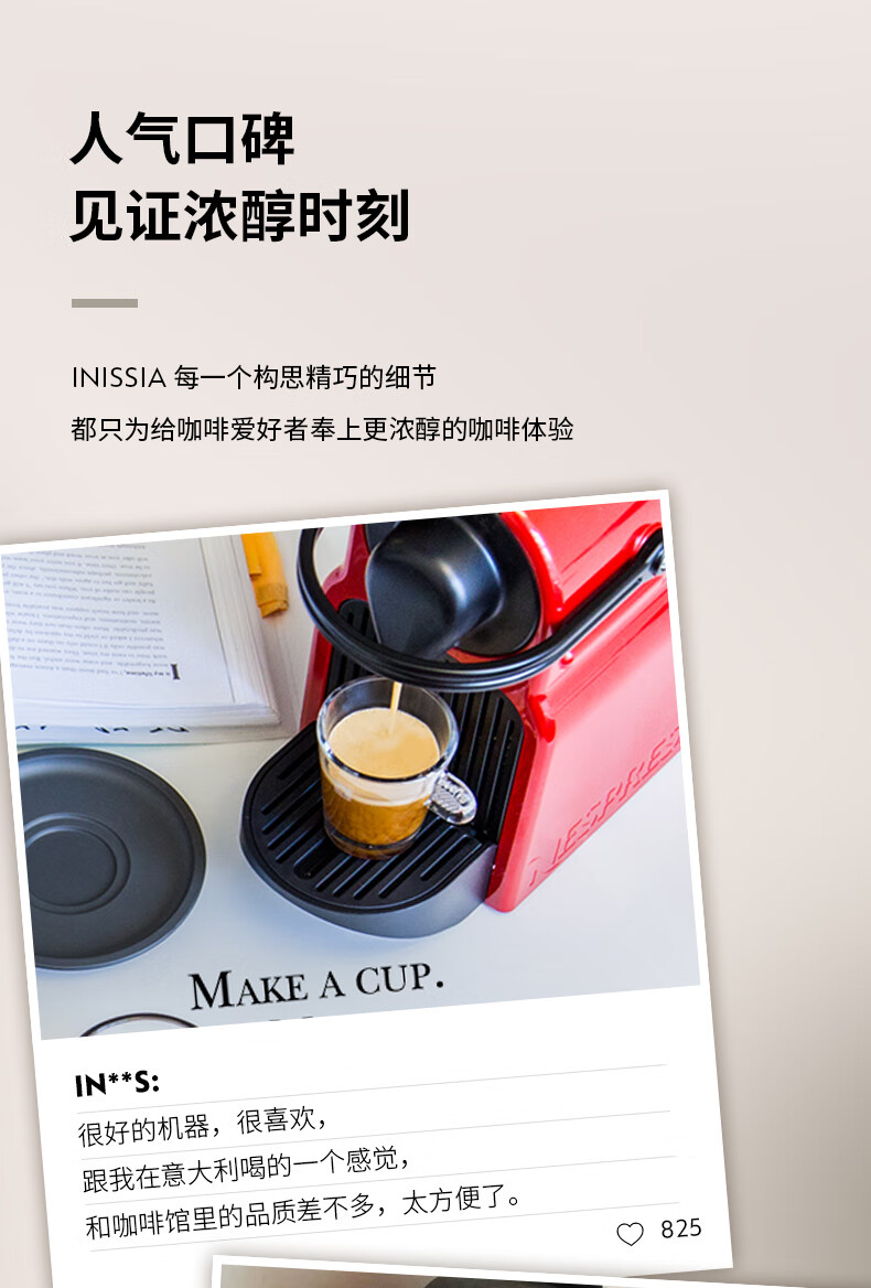认证型号:C40 电源线长:1.2m 额定电压:220V 额定功率:1500W 产品尺寸:长321mm 宽120mm 高230mm 水箱容量:0.6-1.29L 泵浦压力:19Bar 制作口味:卡布奇诺 拿铁 意式浓缩 19Bar高压萃取系统为完整释放与呈现咖啡中的芬芳而设计;快速预热系统能在25秒内达到理想萃取温度结合NESPRESSO稳定的19Bar高压萃取技术感受INISSIA为您带来的柔滑浓郁油脂