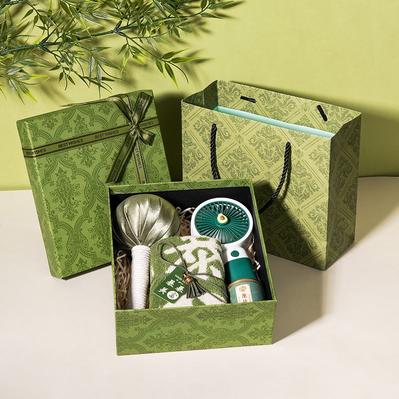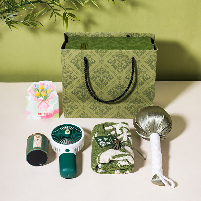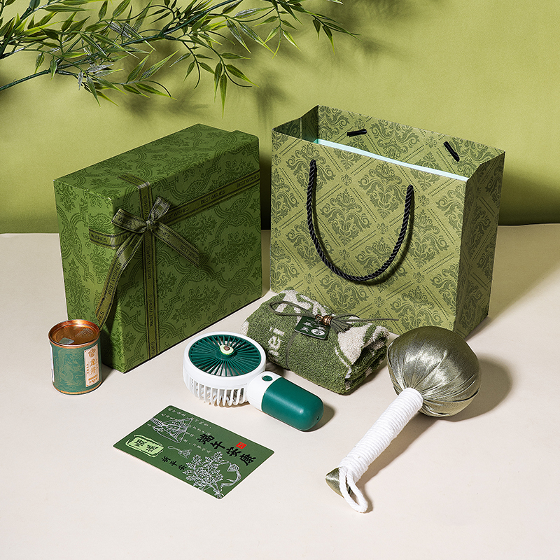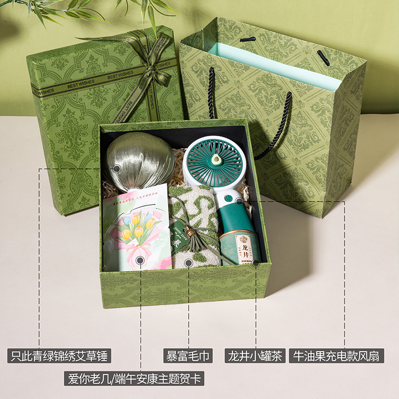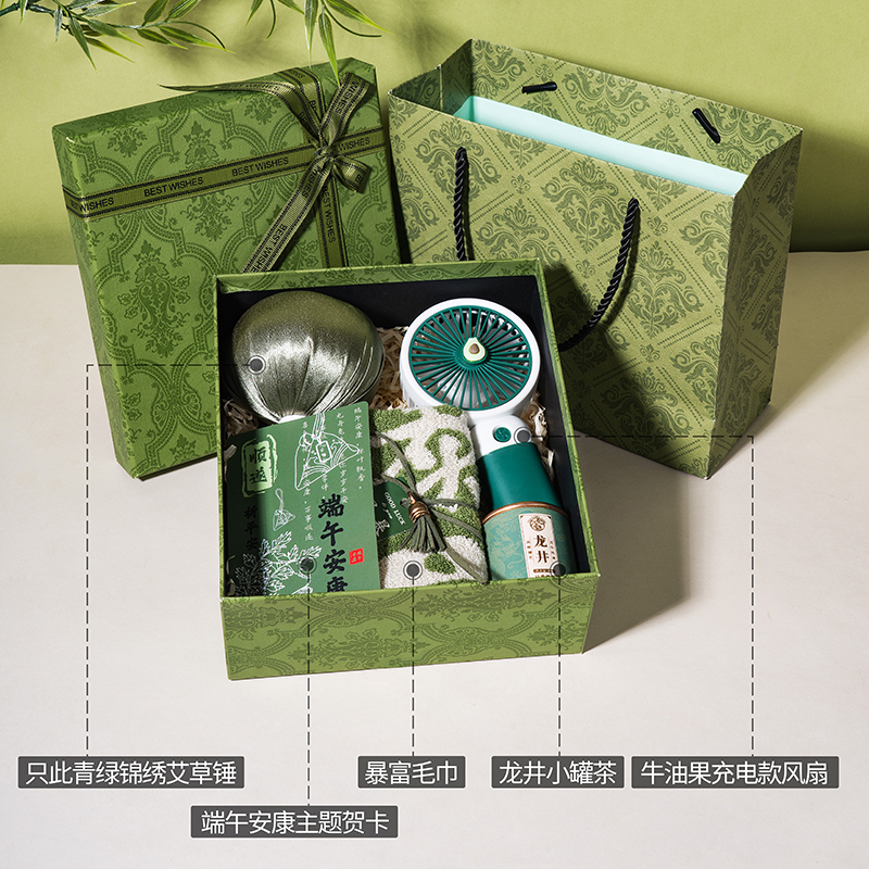 1、精品绿色国潮风礼盒,搭配同风格手提袋,大气上档次,适合商务、福利、礼赠渠道。 2、炎炎夏日,无论工作还是生活,龙井小茶泡起来,牛油果风扇吹起来,好不惬意。 3、丝质艾草养生锤,光滑亮泽,质感满满,敲敲打打解疲惫,锤锤按按享健康! 4、高品质暴富毛巾,洗脸洗澡、擦汗清洁,轻松搞定,日常送礼超实用。 5、可根据客户需求选配爱你老几/端午安康主题贺卡,满满的仪式感和情绪价值