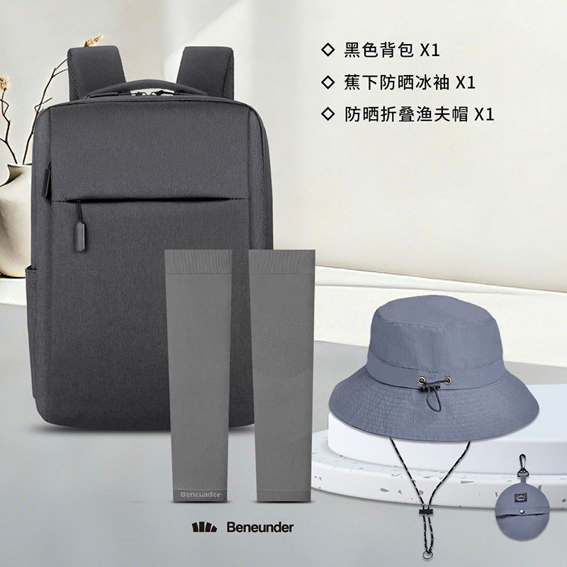 1.注:商城报价对应首张主图款式! 其他套装参考细节图,费用另计! 2. 咨询下单请备注好产品信息! 3.首图款式产品明细:黑色背包(蕉下防晒冰袖+防晒折叠渔夫帽)
