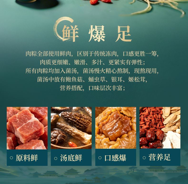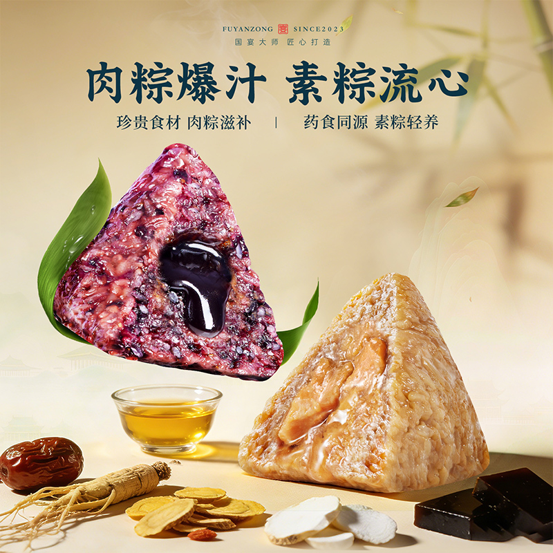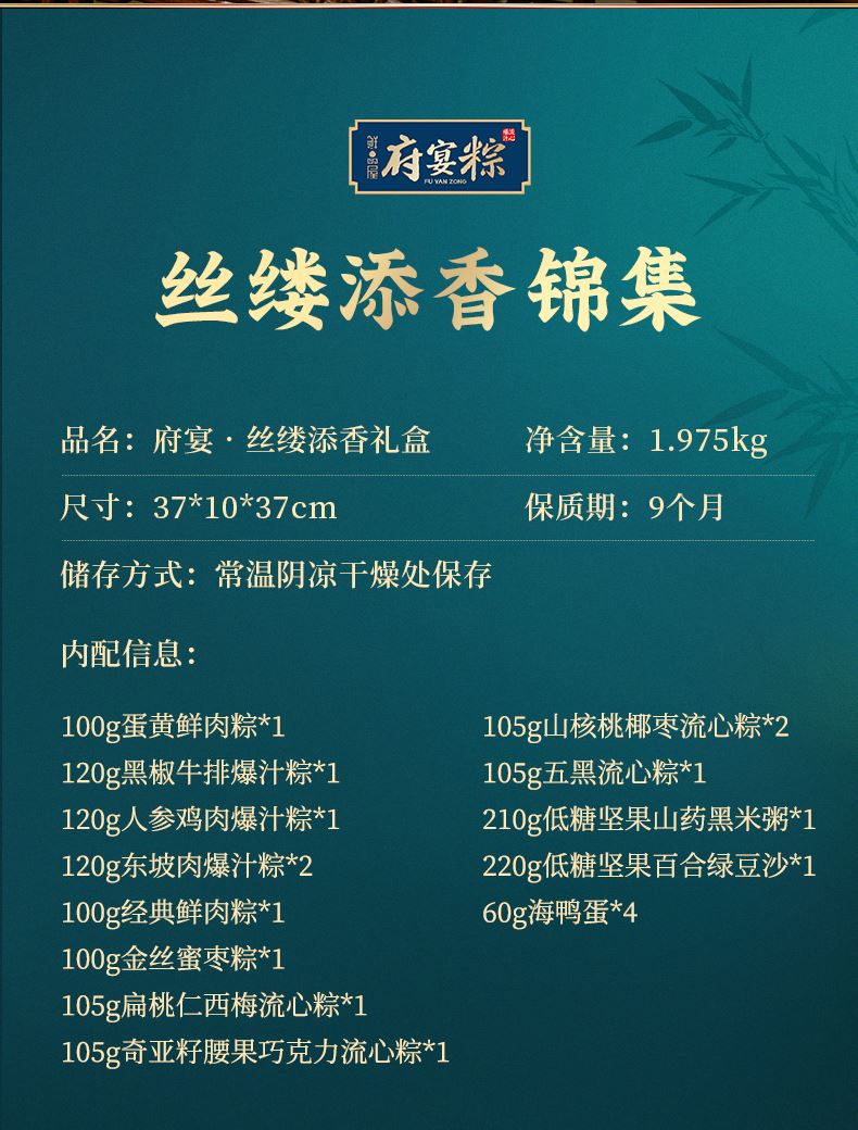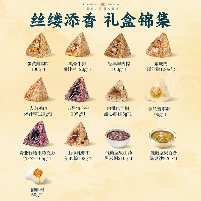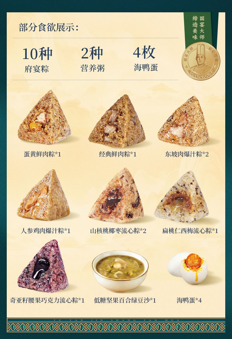 100g蛋黄鲜肉粽*1 120g黑椒牛排爆汁粽*1 120g人参鸡肉爆汁粽*1 120g东坡肉爆汁粽*2 100g经典鲜肉粽*1 100g金丝蜜枣粽*1 105g扁桃仁西梅流心粽*1 105g奇亚籽腰果巧克力流心粽*1 105g山核桃椰枣流心粽*2 105g五黑流心粽*1 210g低糖坚果山药黑米粥*1 220g低糖坚果百合绿豆沙*1 60g海鸭蛋*4
