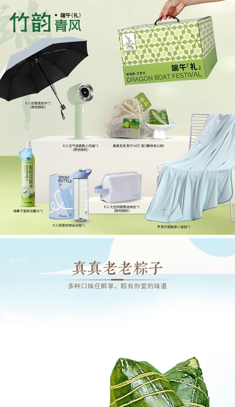 1. 真真老老粽子400克(4只)配棉网束口袋 2. 罗莱双面触感小盖毯100*140cm*1 3. 绿鼻子驱蚊花露水100ML*1 4. K.S.探索防摔运动瓶710ML *1 5. K.S.初晴黑胶伞*1 6. K.S.空气波便携小风扇*1 7. K.S.大空间轻量便携收纳包*1 8. 提手礼盒*1只 真真老老粽子口味(单只100g): 经典鲜肉粽*1 栗子鲜肉粽*1 红袍豆沙粽*1 金丝蜜枣粽*1 国韵雅致几何纹样礼盒,水墨植绘点缀东方意趣,手提设计富有仪式感。更适配客户伴手礼,核心员工福利等多元礼赠场景,尽显尊贵心意。 真真老老粽子、运动水杯、罗莱小盖毯、小风扇、花露水,收纳包每一件单品都藏着生活仪式感,支持小批量专属定制,让节日馈赠更有温度与分量。