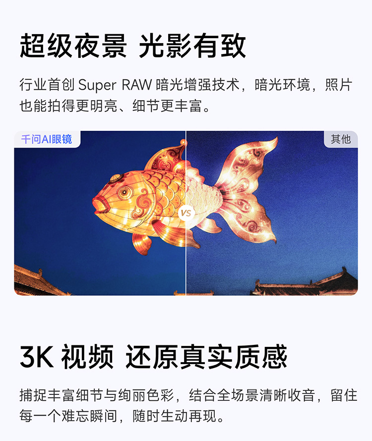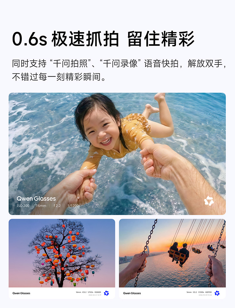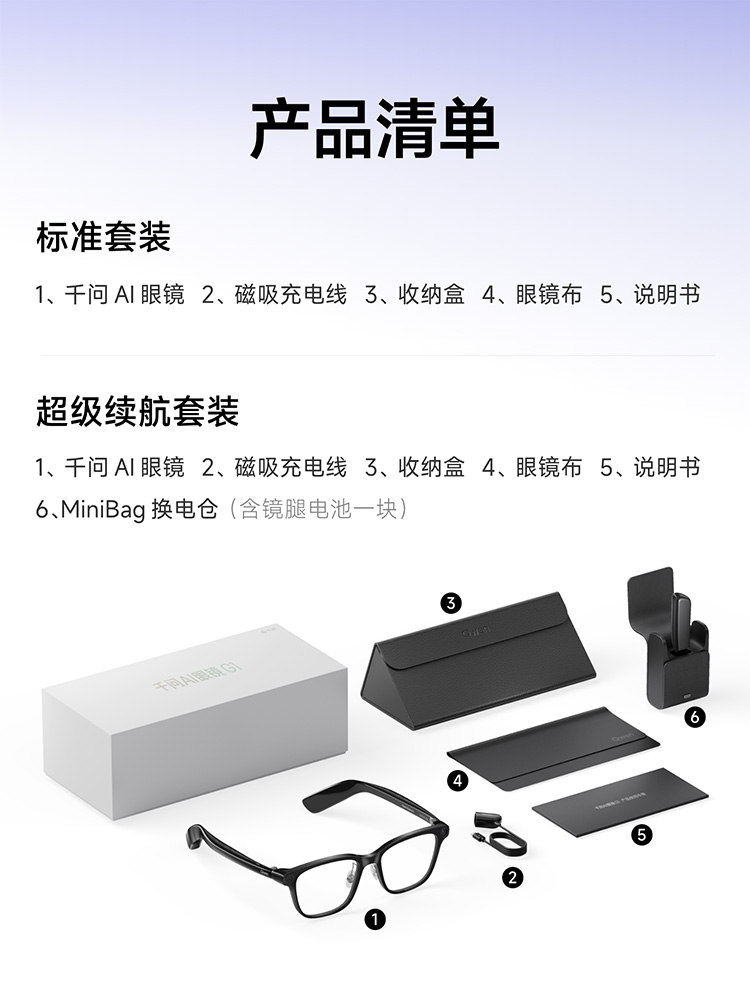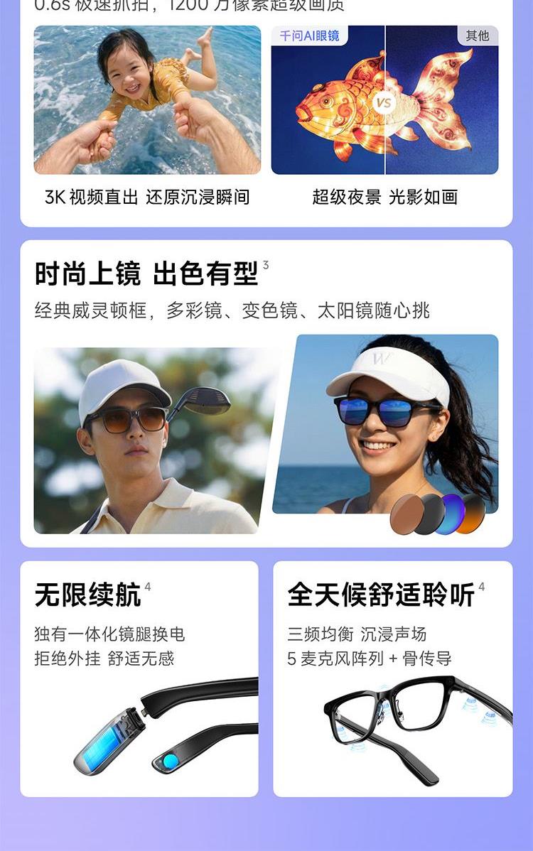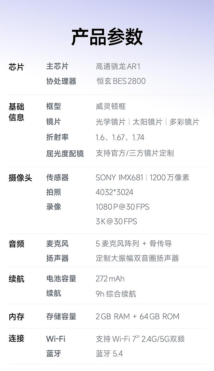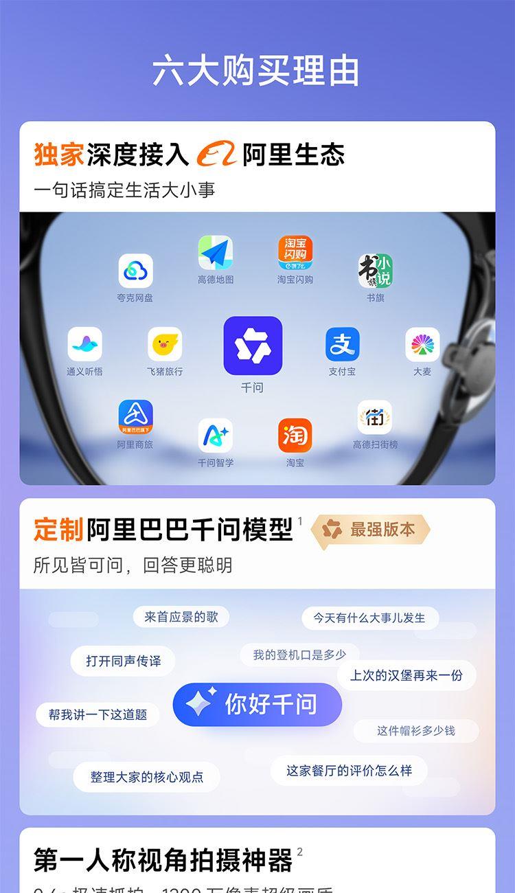 AI能力强:深度定制阿里千问大模型,所见皆可问,图像识别、实时问答、上下文理解更聪明 。 会办事的AI:接入阿里生态(支付宝、高德、淘宝、飞猪等),一句话点外卖、订酒店、查行程、导航 。 轻量化:约40g、镜腿薄至8mm,佩戴如普通眼镜。 旗舰影像:1200万像素索尼传感器,0.6秒抓拍、3K视频、Super RAW暗光增强、64GB大存储。 音频专业:嘈杂环境语音准、通话清晰。 续航无忧:热插拔换电,综合续航9小时。 双芯流畅:AI响应快、多任务不卡。 产品参数 芯片:主芯片 高通骁龙AR1 协处理器恒玄 BES2800 基础信息:框型 威灵顿框 镜片 光学镜片|太阳镜片|多彩镜片 折射率 1.6、1.67、1.74 屈光度配镜: 支持官方/三方镜片定制 摄像头:传感器 SONY IMX681|1200万像素 拍照 4032*3024 录像 1080P@30FPS 3K@30FPS 音频:麦克风 5 麦克风阵列 +骨传导 扬声器 定制大振幅双音圈扬声器 续航:电池容量 272 mAh 续航 9h 综合续航 内存: 存储容量 2GB RAM + 64GB ROM 连接:Wi-Fi 支持Wi-Fi 7”2.4G/5G双频 蓝牙 蓝牙 5.4 其他:防水级别 IPX42 手机系统 支持安卓 10.0 或 iOS14.4 及以上, 支持鸿蒙 4 系统,暂不支持鸿蒙5 及以上 认证 SRRC/CQC/ROHS/UN38.3/ 质检报告/苹果 MFi 认证