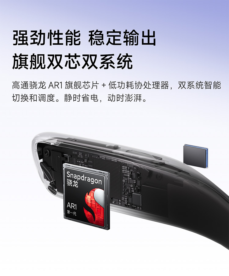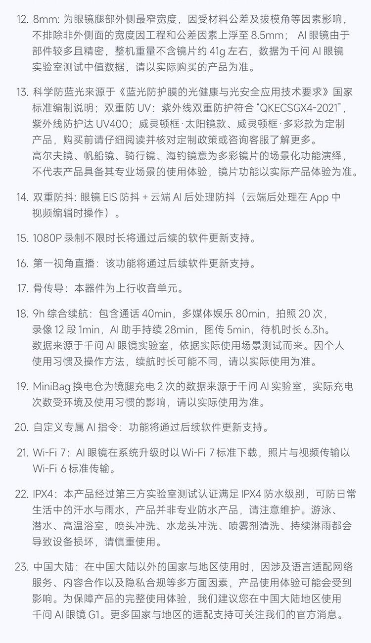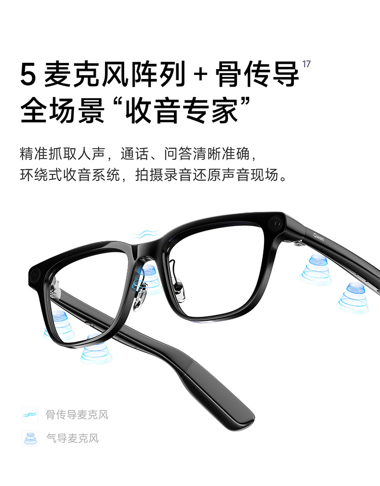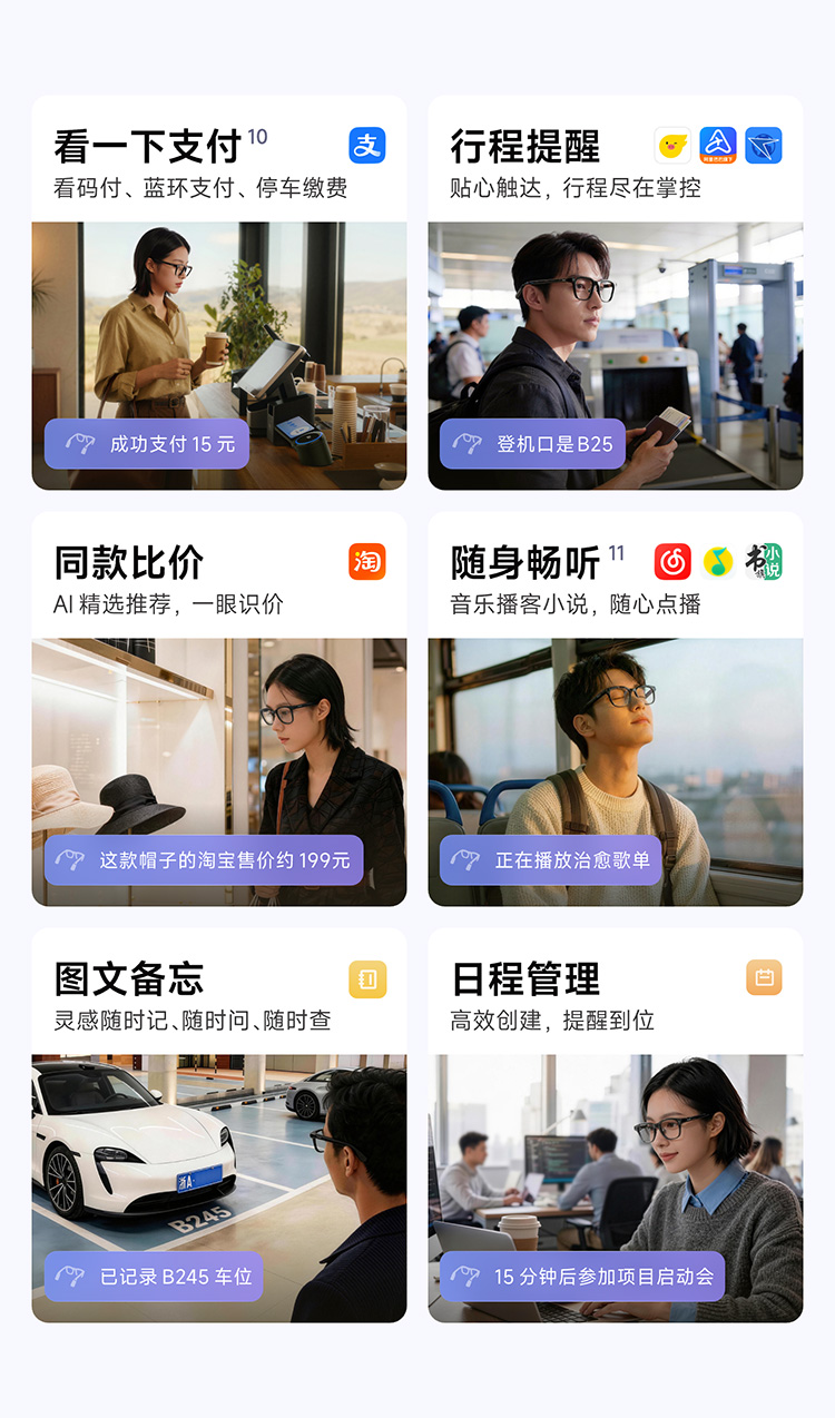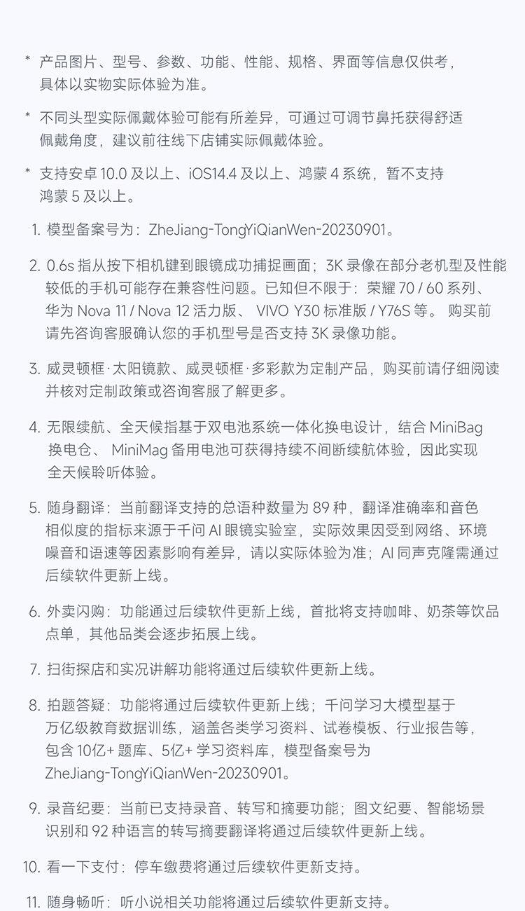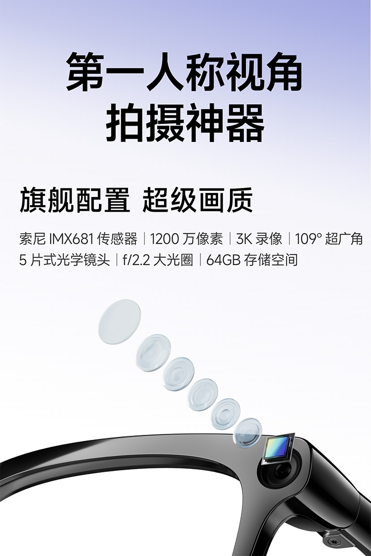 AI能力强:深度定制阿里千问大模型,所见皆可问,图像识别、实时问答、上下文理解更聪明 。 会办事的AI:接入阿里生态(支付宝、高德、淘宝、飞猪等),一句话点外卖、订酒店、查行程、导航 。 轻量化:约40g、镜腿薄至8mm,佩戴如普通眼镜。 旗舰影像:1200万像素索尼传感器,0.6秒抓拍、3K视频、Super RAW暗光增强、64GB大存储。 音频专业:嘈杂环境语音准、通话清晰。 续航无忧:热插拔换电,综合续航9小时。 双芯流畅:AI响应快、多任务不卡。 产品参数 芯片:主芯片 高通骁龙AR1 协处理器恒玄 BES2800 基础信息:框型 威灵顿框 镜片 光学镜片|太阳镜片|多彩镜片 折射率 1.6、1.67、1.74 屈光度配镜: 支持官方/三方镜片定制 摄像头:传感器 SONY IMX681|1200万像素 拍照 4032*3024 录像 1080P@30FPS 3K@30FPS 音频:麦克风 5 麦克风阵列 +骨传导 扬声器 定制大振幅双音圈扬声器 续航:电池容量 272 mAh 续航 9h 综合续航 内存: 存储容量 2GB RAM + 64GB ROM 连接:Wi-Fi 支持Wi-Fi 7”2.4G/5G双频 蓝牙 蓝牙 5.4 其他:防水级别 IPX42 手机系统 支持安卓 10.0 或 iOS14.4 及以上, 支持鸿蒙 4 系统,暂不支持鸿蒙5 及以上 认证 SRRC/CQC/ROHS/UN38.3/ 质检报告/苹果 MFi 认证