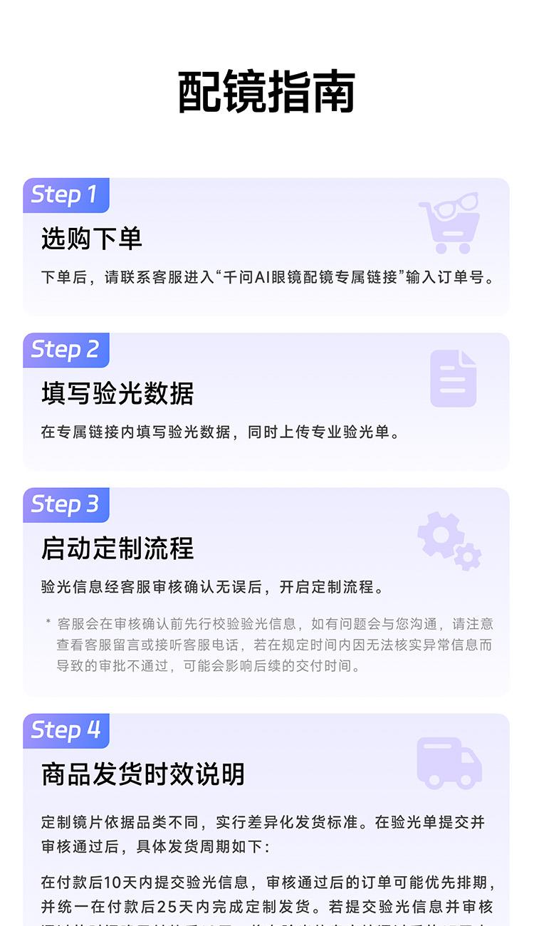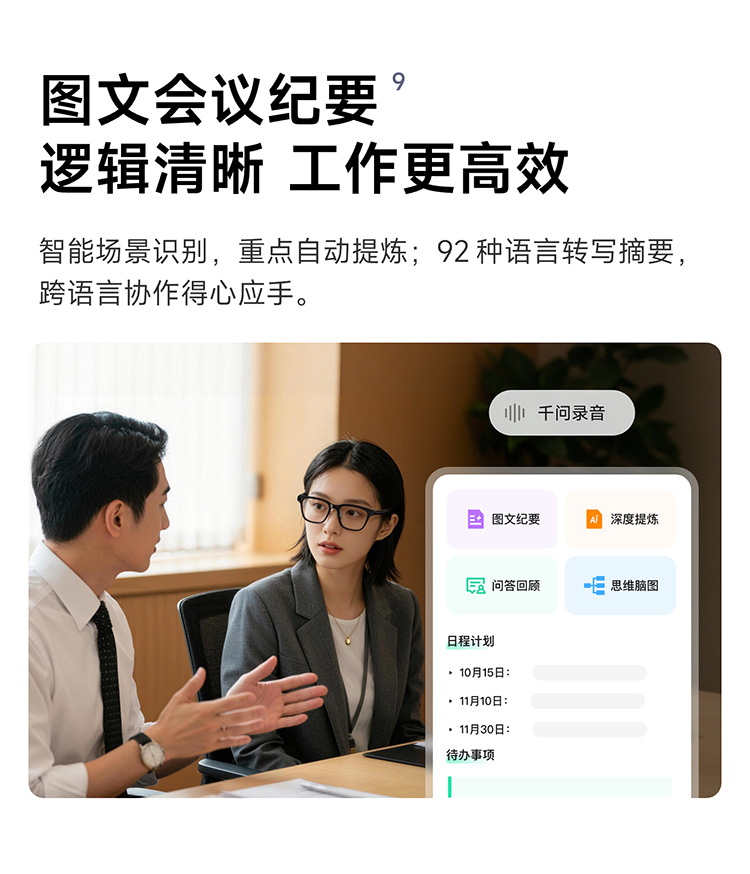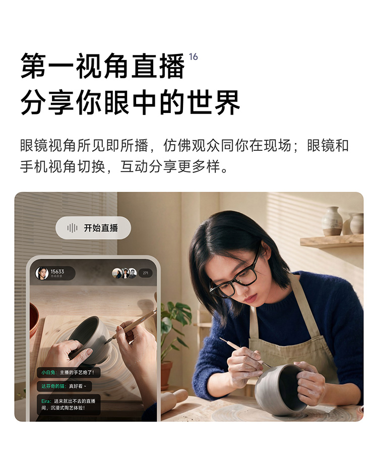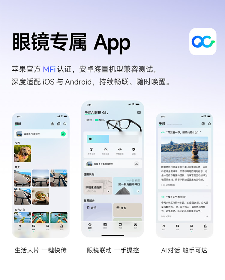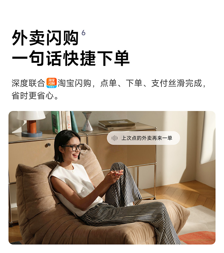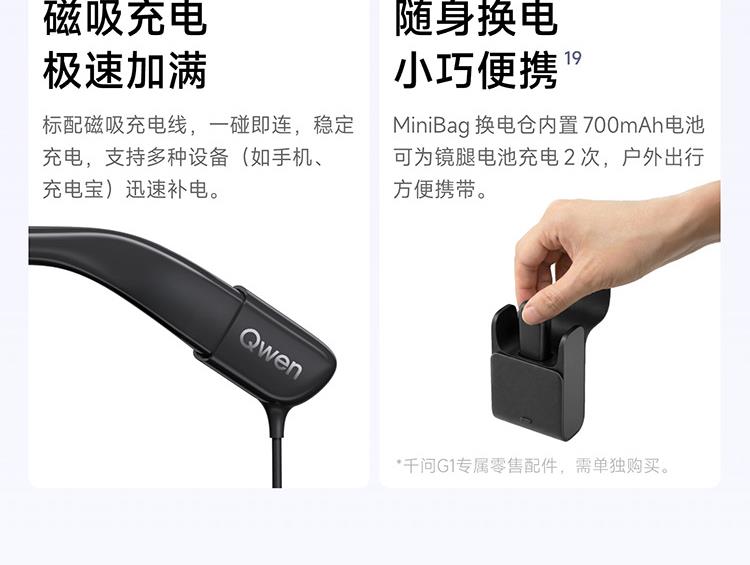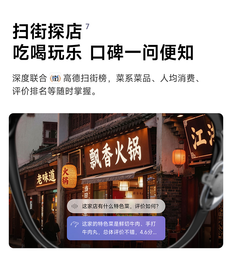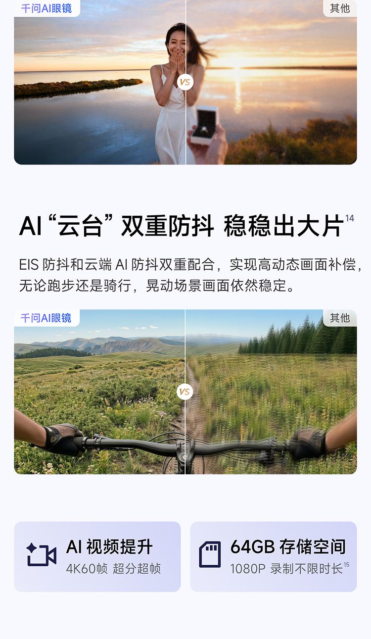 AI能力强:深度定制阿里千问大模型,所见皆可问,图像识别、实时问答、上下文理解更聪明 。 会办事的AI:接入阿里生态(支付宝、高德、淘宝、飞猪等),一句话点外卖、订酒店、查行程、导航 。 轻量化:约40g、镜腿薄至8mm,佩戴如普通眼镜。 旗舰影像:1200万像素索尼传感器,0.6秒抓拍、3K视频、Super RAW暗光增强、64GB大存储。 音频专业:嘈杂环境语音准、通话清晰。 续航无忧:热插拔换电,综合续航9小时。 双芯流畅:AI响应快、多任务不卡。 产品参数 芯片:主芯片 高通骁龙AR1 协处理器恒玄 BES2800 基础信息:框型 威灵顿框 镜片 光学镜片|太阳镜片|多彩镜片 折射率 1.6、1.67、1.74 屈光度配镜: 支持官方/三方镜片定制 摄像头:传感器 SONY IMX681|1200万像素 拍照 4032*3024 录像 1080P@30FPS 3K@30FPS 音频:麦克风 5 麦克风阵列 +骨传导 扬声器 定制大振幅双音圈扬声器 续航:电池容量 272 mAh 续航 9h 综合续航 内存: 存储容量 2GB RAM + 64GB ROM 连接:Wi-Fi 支持Wi-Fi 7”2.4G/5G双频 蓝牙 蓝牙 5.4 其他:防水级别 IPX42 手机系统 支持安卓 10.0 或 iOS14.4 及以上, 支持鸿蒙 4 系统,暂不支持鸿蒙5 及以上 认证 SRRC/CQC/ROHS/UN38.3/ 质检报告/苹果 MFi 认证