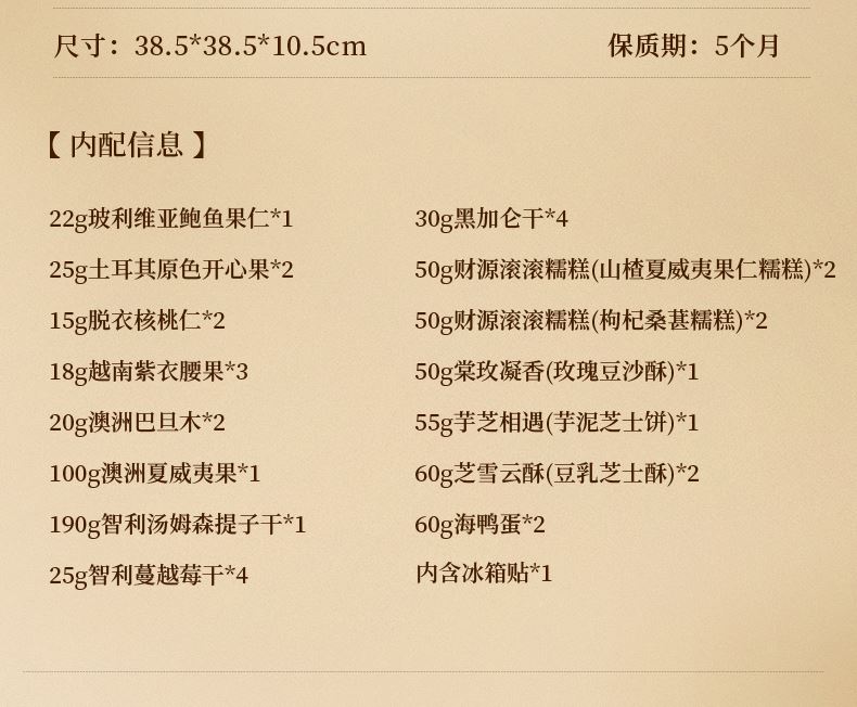 22g玻利维亚鲍鱼果仁*1 25g土耳其原色开心果*2 15g脱衣核桃仁*2 18g越南紫衣腰果*3 20g澳洲巴旦木*2 25g智利蔓越莓干*4 30g黑加仑干*4 50g财源滚滚糯糕(山楂夏威夷果仁糯糕)*2 50g财源滚滚糯糕(枸杞桑葚糯糕)*2 50g棠玫凝香(玫瑰豆沙酥)*1 55g芋芝相遇(芋泥芝士饼)*1 60g芝雪云酥(豆乳芝士酥)*2 100g澳洲夏威夷果*1 190g智利汤姆森提子干*1 60g海鸭蛋*2 赠品-冰箱贴*1