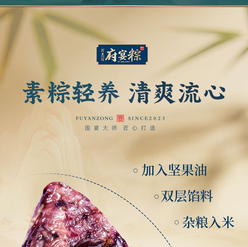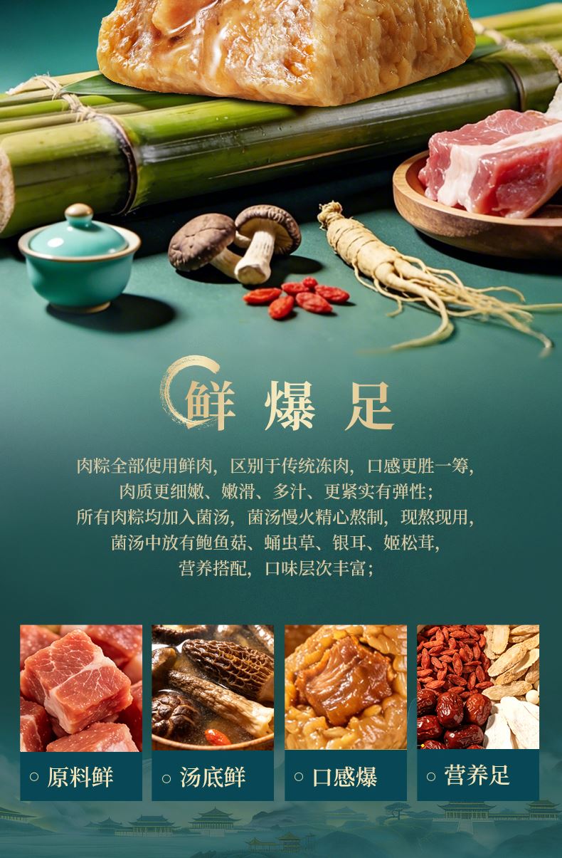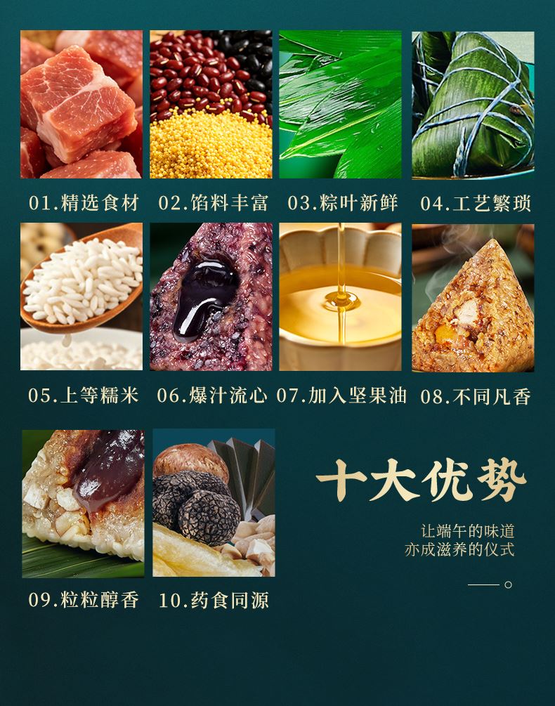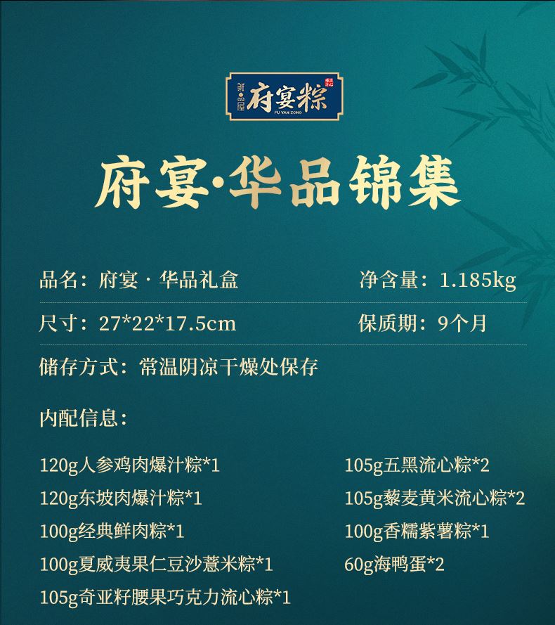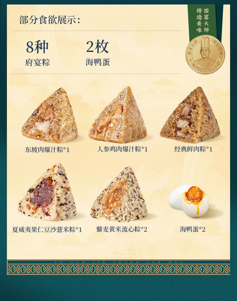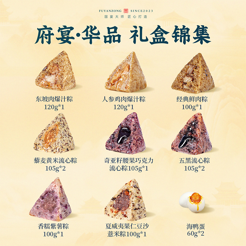120g人参鸡肉爆汁粽*1 120g东坡肉爆汁粽*1 100g经典鲜肉粽*1 105g奇亚籽腰果巧克力流心粽*1 105g五黑流心粽*2 105g藜麦黄米流心粽*2 100g夏威夷果仁豆沙薏米粽*1 100g香糯紫薯粽*1 60g海鸭蛋*2