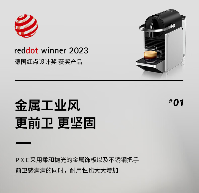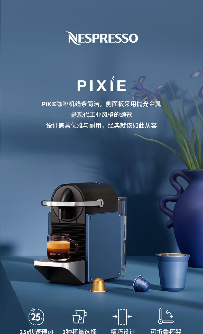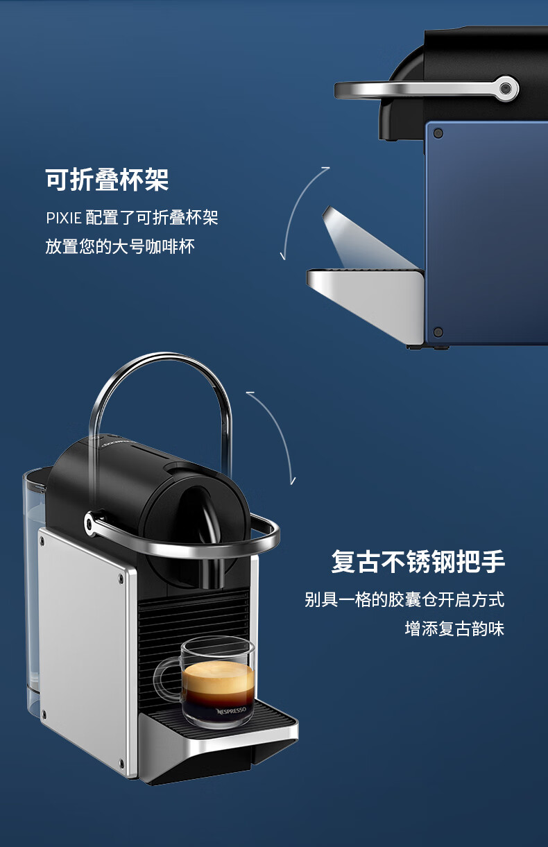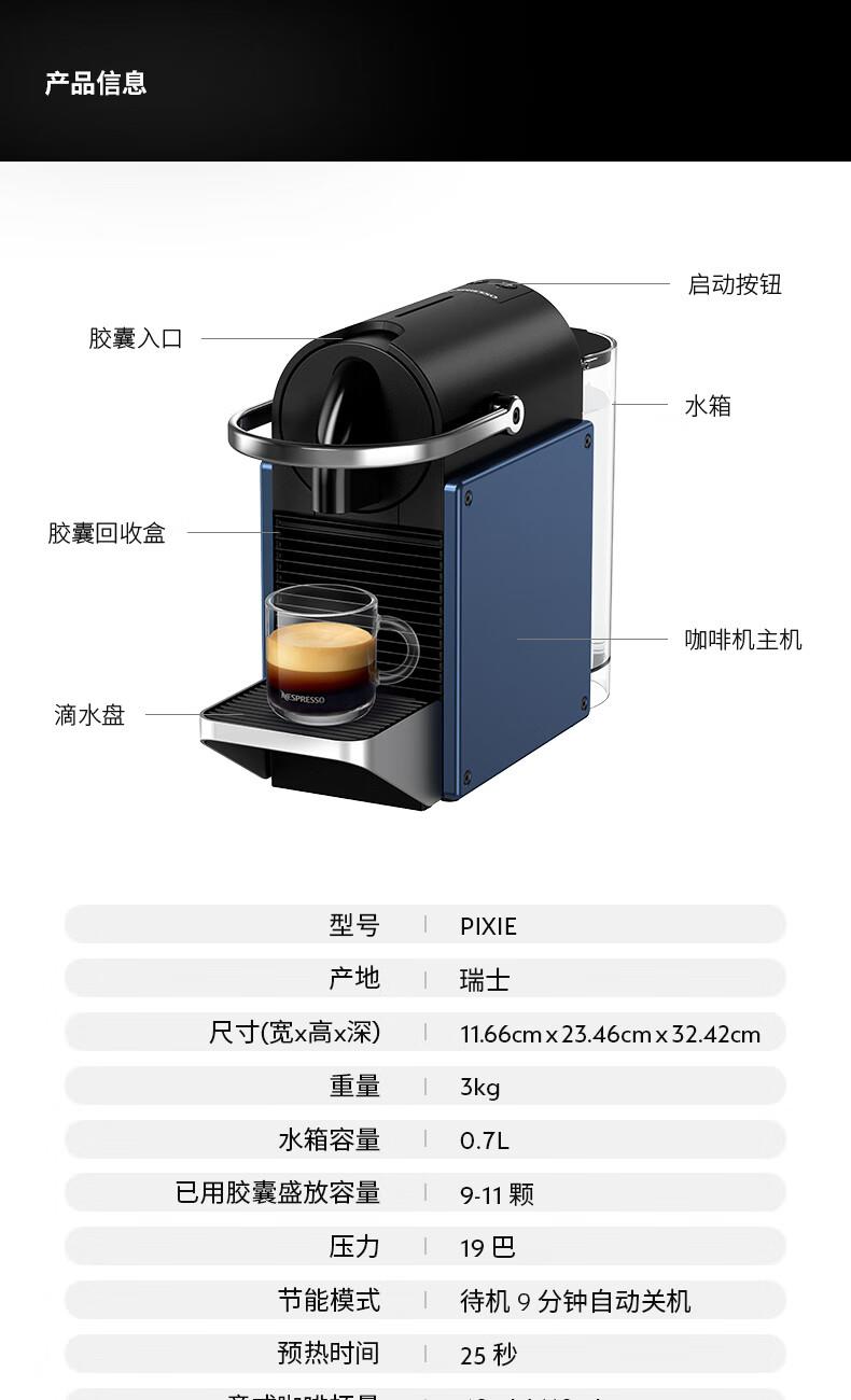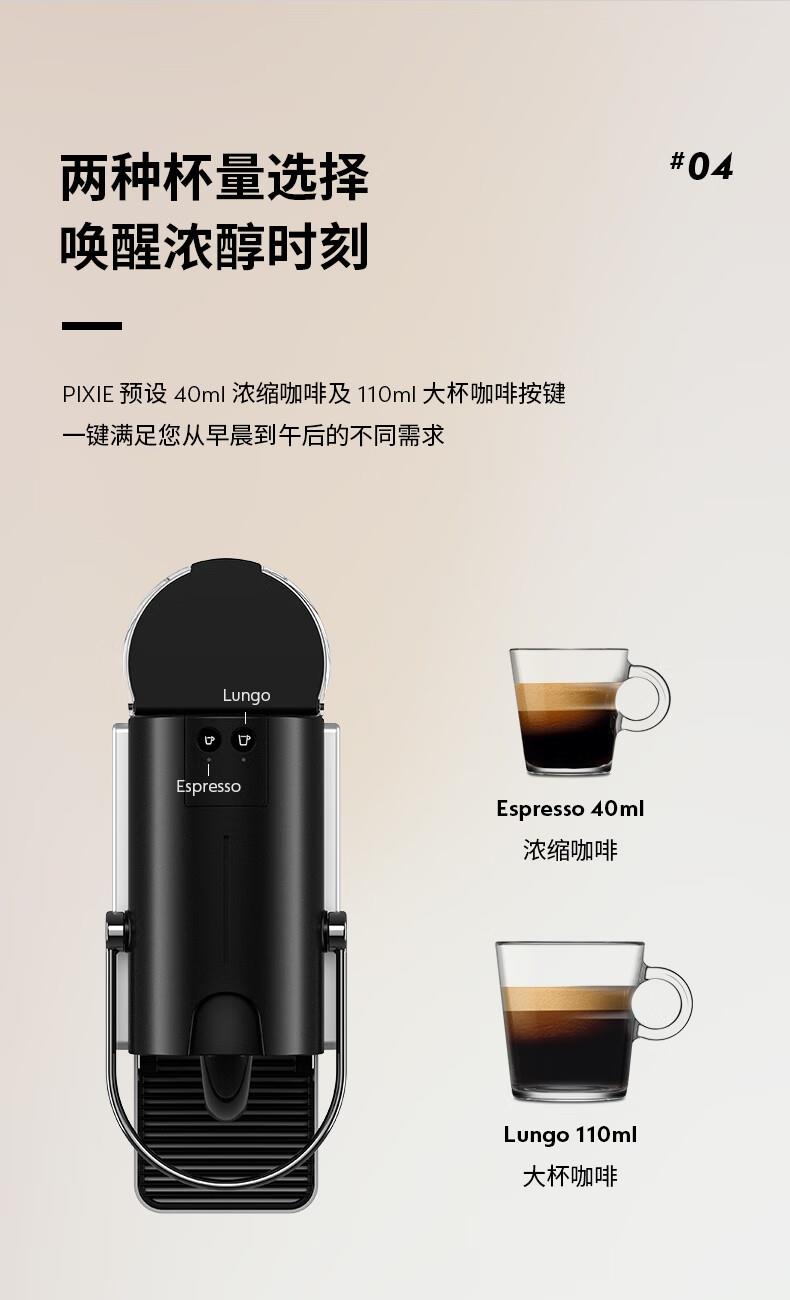 型号:D62 电源线长:1.2m 额定电压:220V 额定功率:1150W 产品尺寸:长116.6mm 宽234.6mm 高324.2mm 水箱容量:0.6-1.29L 泵浦压力:19Bar 制作口味:卡布奇诺 拿铁 意式浓缩 PIXIE咖啡机线条简洁,侧面板采用抛光金属是现代工业风格的颂歌设计兼具优雅与耐用,经典就该如此从容。 两种杯量选择唤醒浓醇时刻; PIXIE 预设40ml浓缩咖啡及110ml大杯咖啡按键一键满足您从早晨到午后的不同需求。