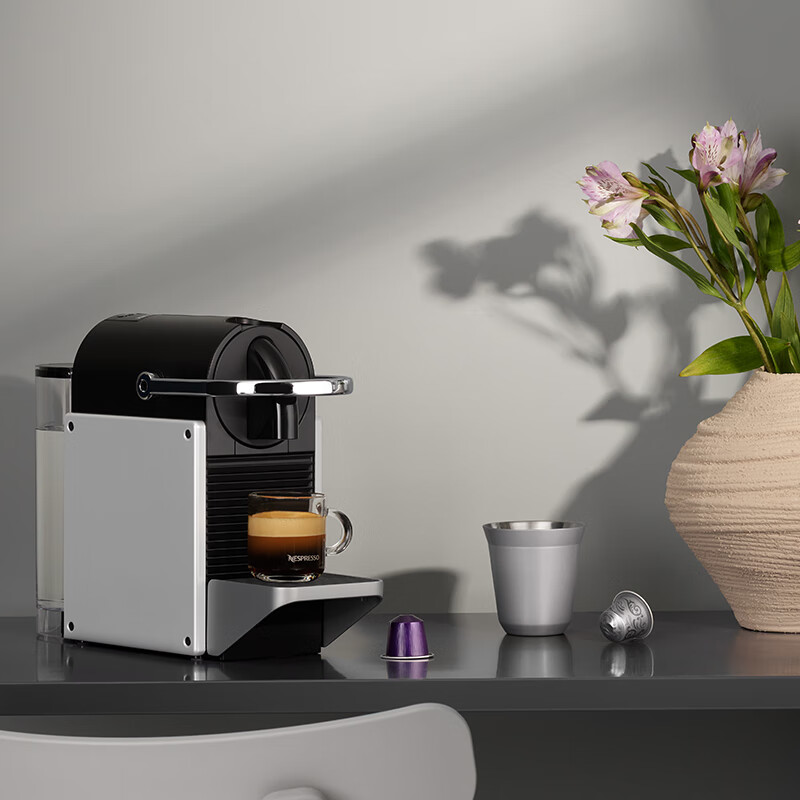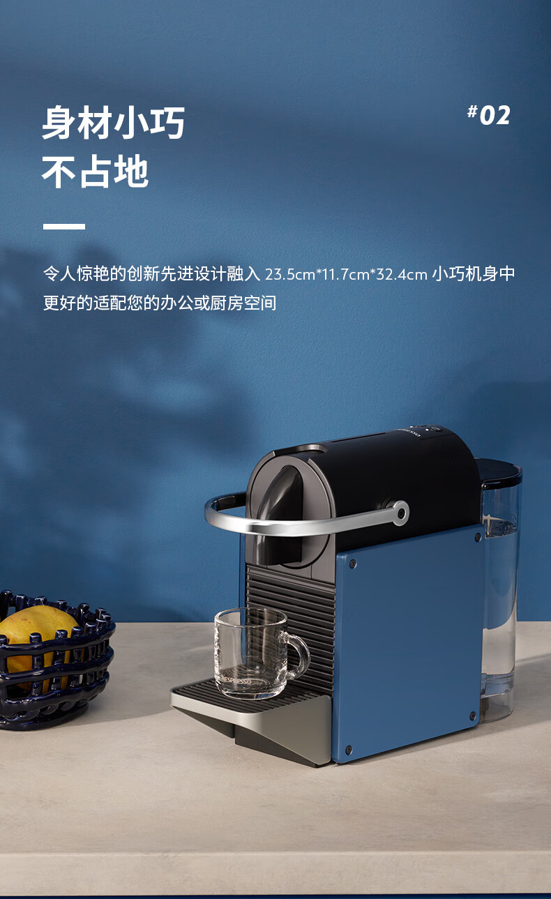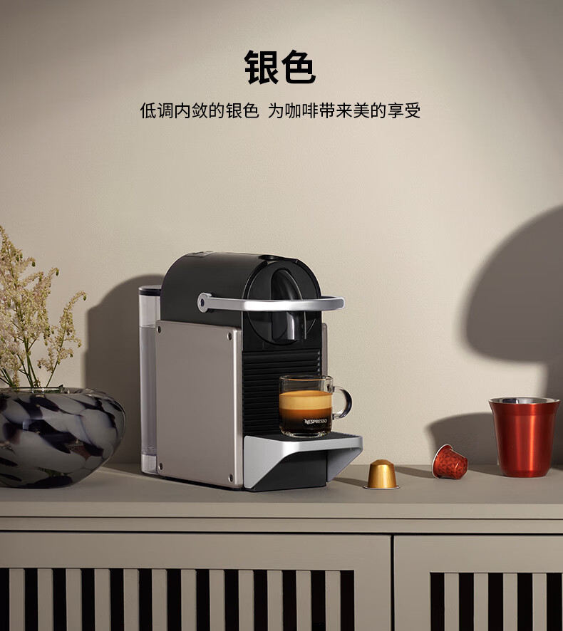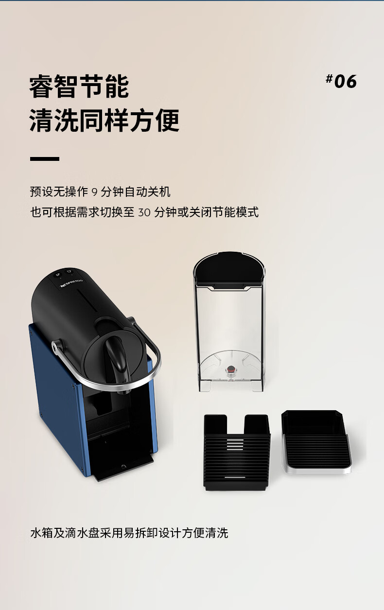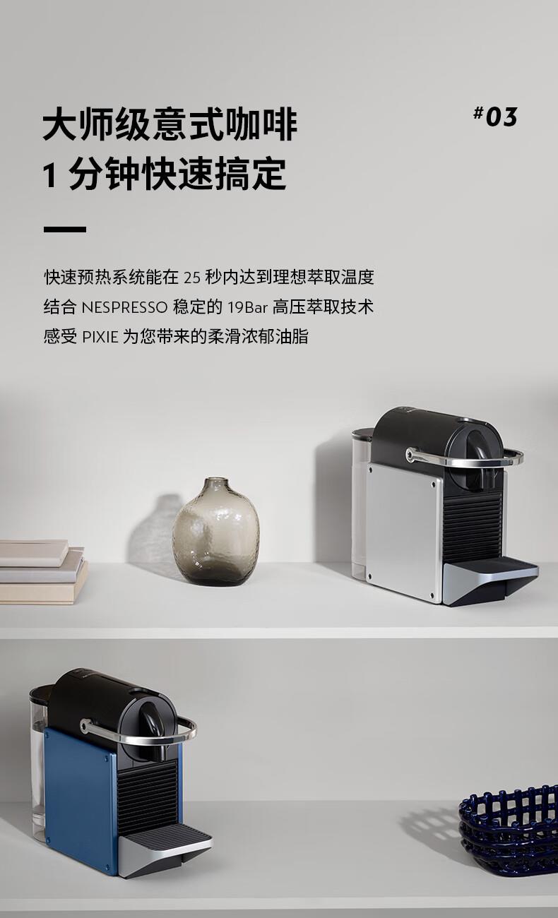 型号:D62 电源线长:1.2m 额定电压:220V 额定功率:1150W 产品尺寸:长116.6mm 宽234.6mm 高324.2mm 水箱容量:0.6-1.29L 泵浦压力:19Bar 制作口味:卡布奇诺 拿铁 意式浓缩 PIXIE咖啡机线条简洁,侧面板采用抛光金属是现代工业风格的颂歌设计兼具优雅与耐用,经典就该如此从容。 两种杯量选择唤醒浓醇时刻; PIXIE 预设40ml浓缩咖啡及110ml大杯咖啡按键一键满足您从早晨到午后的不同需求。