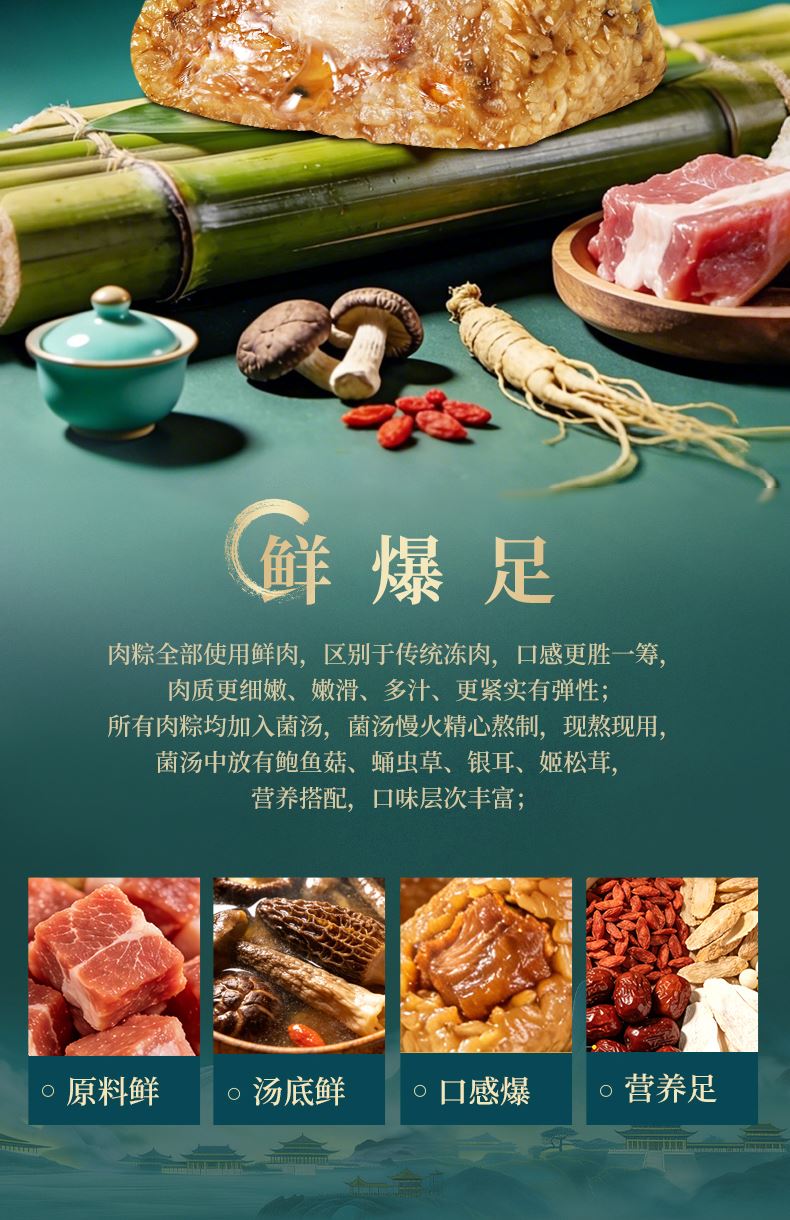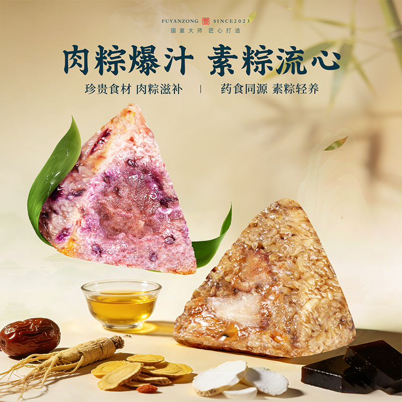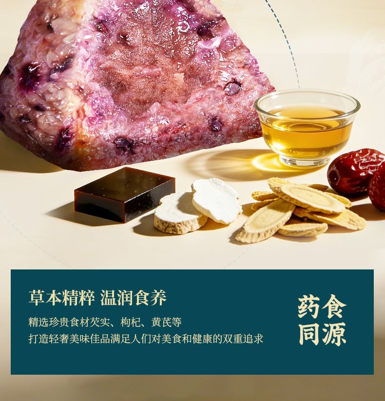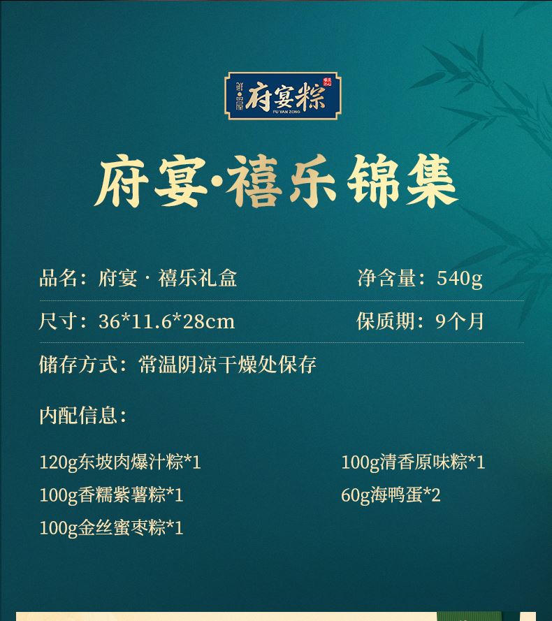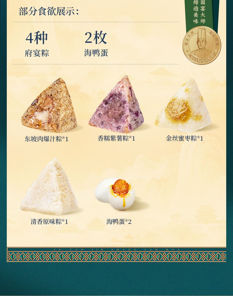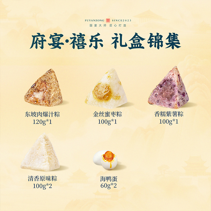 120g东坡肉爆汁粽*1 100g香糯紫薯粽*1 100g金丝蜜枣粽*1 100g清香原味粽*1 60g海鸭蛋*2