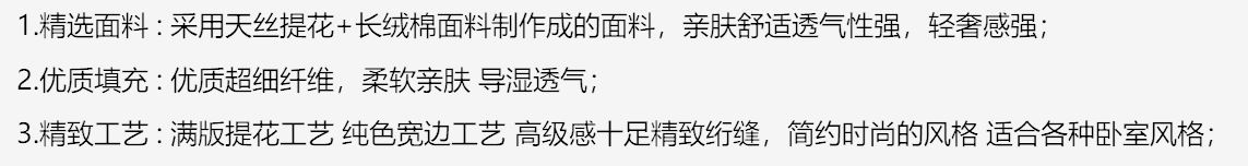 货 号 :HXB-2612 面 料 :天丝长绒棉 填 充 :超细纤维 规 格 :200*230cm 重 量 :1400g 包装尺寸 :48x36x13.5cm 装 箱明细 :8床/箱或50条/包 1.精选面料 : 采用天丝提花+长绒棉面料制作成的面料,亲肤舒适透气性强,轻奢感强; 2.优质填充 : 优质超细纤维,柔软亲肤 导湿透气; 3.精致工艺 : 满版提花工艺 纯色宽边工艺 高 级感十足精致绗缝,简约时尚的风格 适合各种卧室风格;