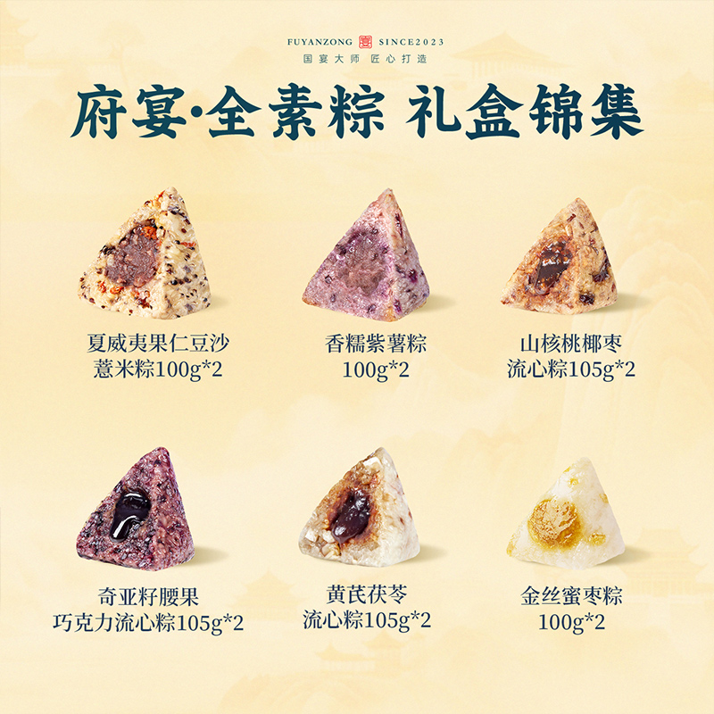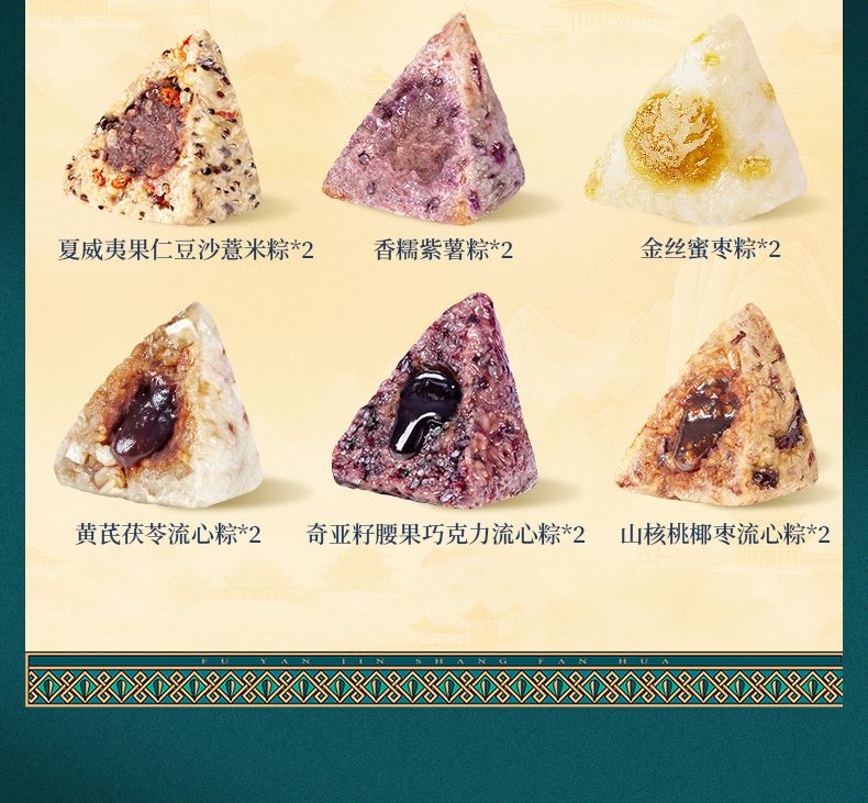 100g夏威夷果仁豆沙薏米粽*2 100g香糯紫薯粽*2 100g金丝蜜枣粽*2 105g黄芪茯苓流心粽*2 105g奇亚籽腰果巧克力流心粽*2 105g山核桃椰枣流心粽*2