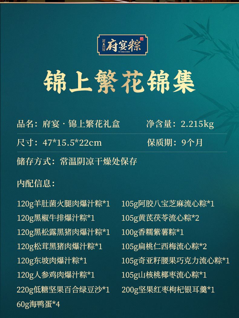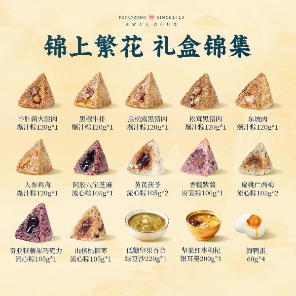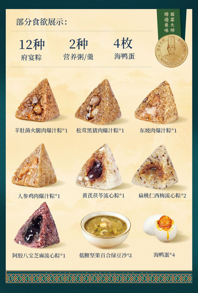 120g羊肚菌火腿肉爆汁粽*1 120g黑椒牛排爆汁粽*1 120g黑松露黑猪肉爆汁粽*1 120g松茸黑猪肉爆汁粽*1 120g东坡肉爆汁粽*1 120g人参鸡肉爆汁粽*1 105g阿胶八宝芝麻流心粽*1 105g黄芪茯苓流心粽*2 100g香糯紫薯粽*1 105g扁桃仁西梅流心粽*2 105g奇亚籽腰果巧克力流心粽*1 105g山核桃椰枣流心粽*1 220g低糖坚果百合绿豆沙*1 200g坚果红枣枸杞银耳羹*1 60g海鸭蛋*4