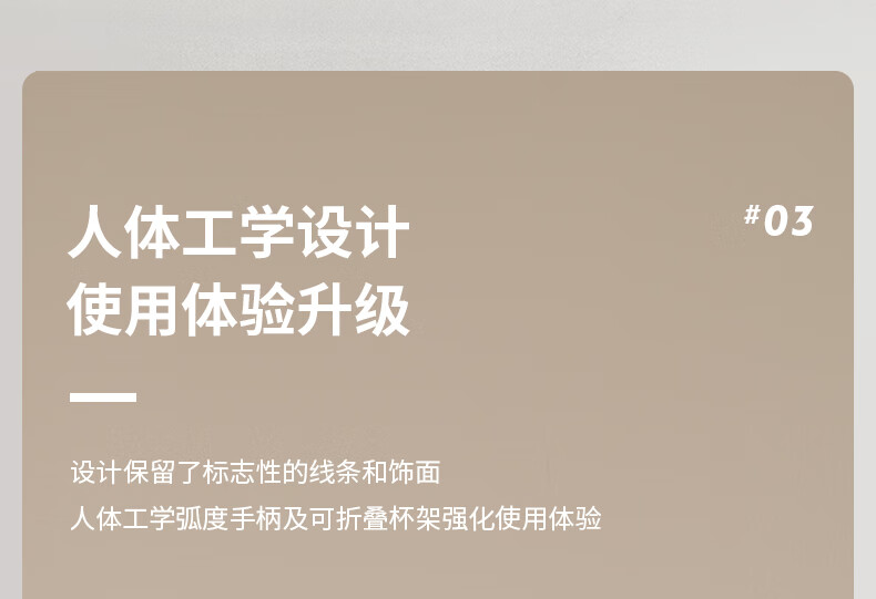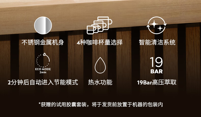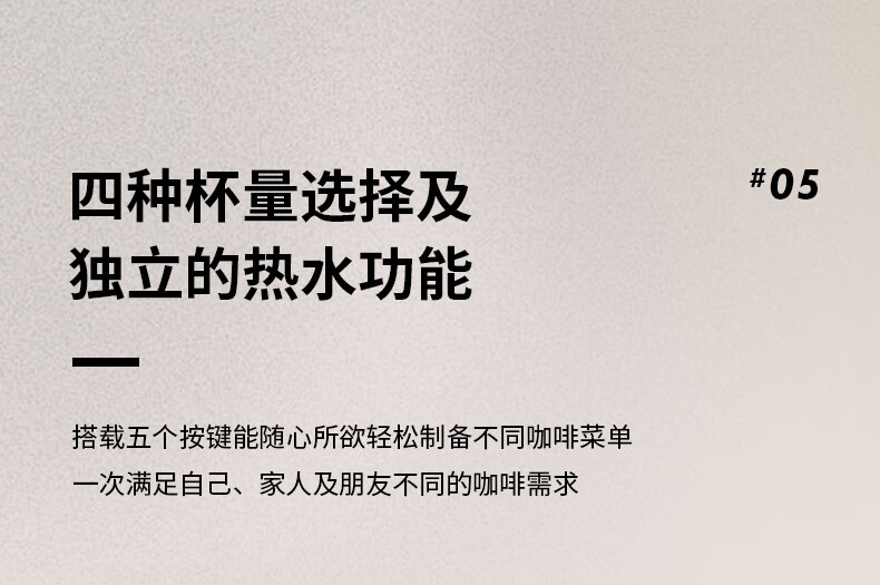 型号:C140 电源线长:1.2m 额定电压:220V 额定功率:1170W 产品尺寸:长130mm 宽389mm 高277mm 水箱容量:0.6-1.29L 泵浦压力:19Bar 制作口味:卡布奇诺 拿铁 意式浓缩 时尚、复古的现代设计标志性的线条和金属表面处理将为您的厨房空间平添优雅气息; 设计保留了标志性的线条和饰面人体工学弧度手柄及可折叠杯架强化使用体验;