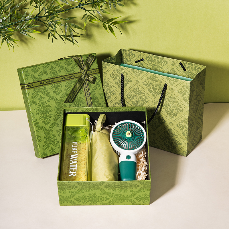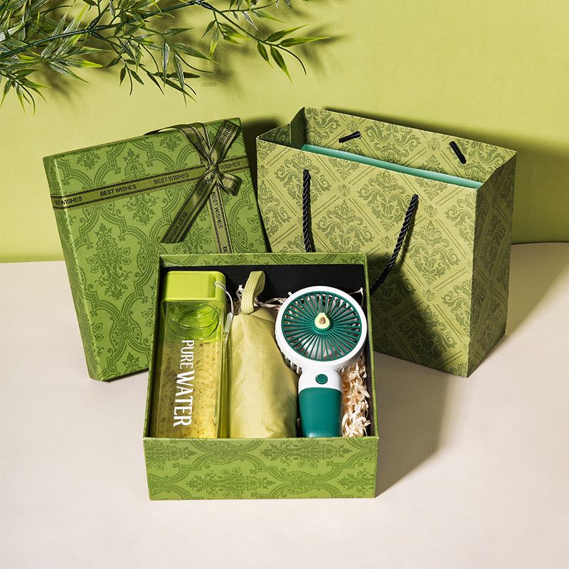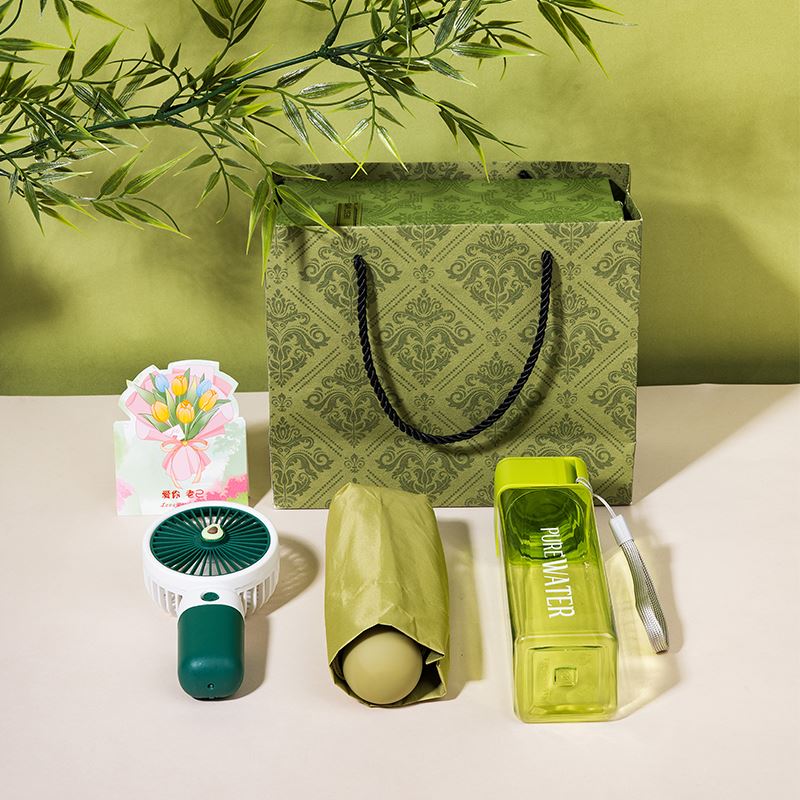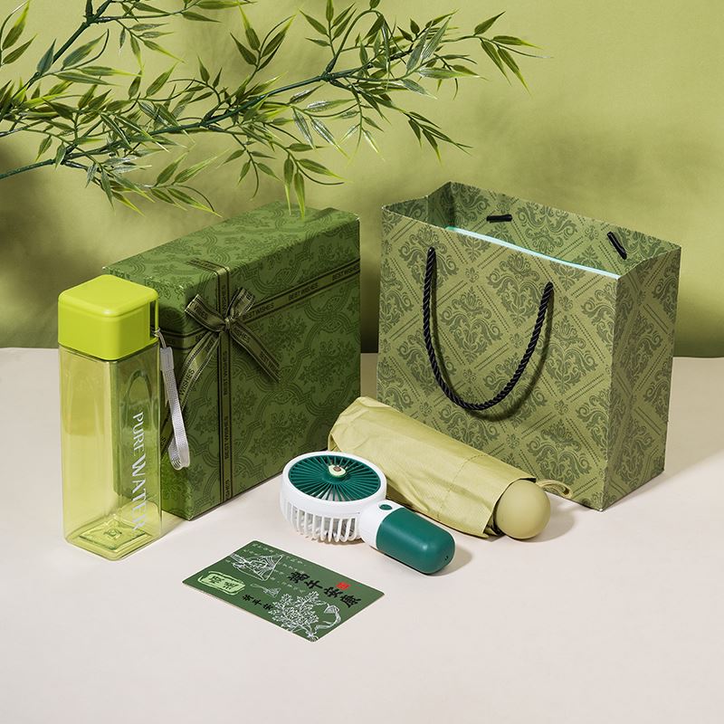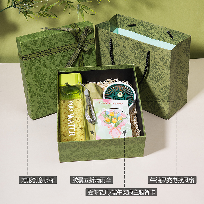 1、精品绿色国潮风礼盒,搭配同风格手提袋,大气上档次,商务馈赠、员工福利、节日礼赠都体面合适。 2、500ml方形创意水杯,便携实用,日常补水更有仪式感,贴心又百搭。 3、牛油果充电款小风扇,颜值与清凉兼备,轻音续航,随身带走一整夏的清爽。 4、胶囊五折晴雨伞,小巧便携,晴雨两用,防晒遮阳、遮风挡雨,出行安心又省心。 5、可根据客户需求选配爱你老几/端午安康主题贺卡,满满的仪式感和情绪价值