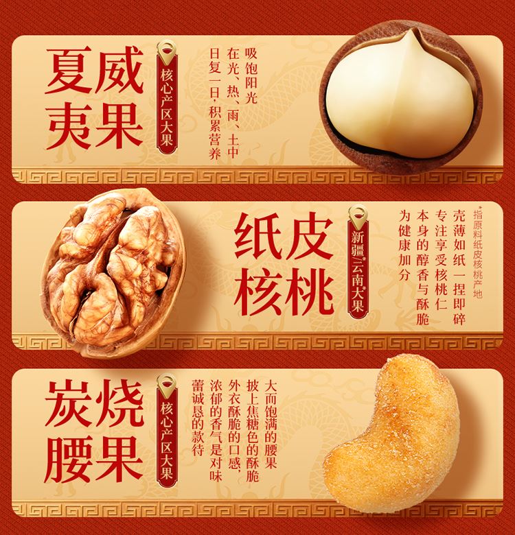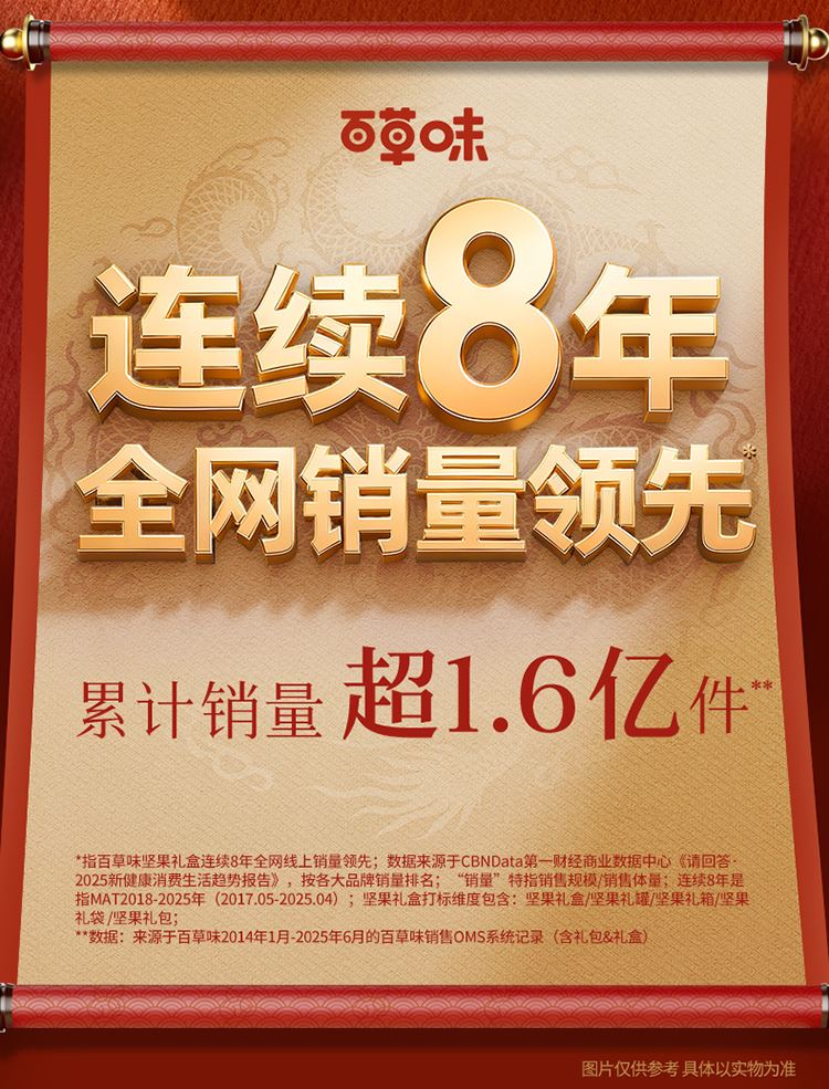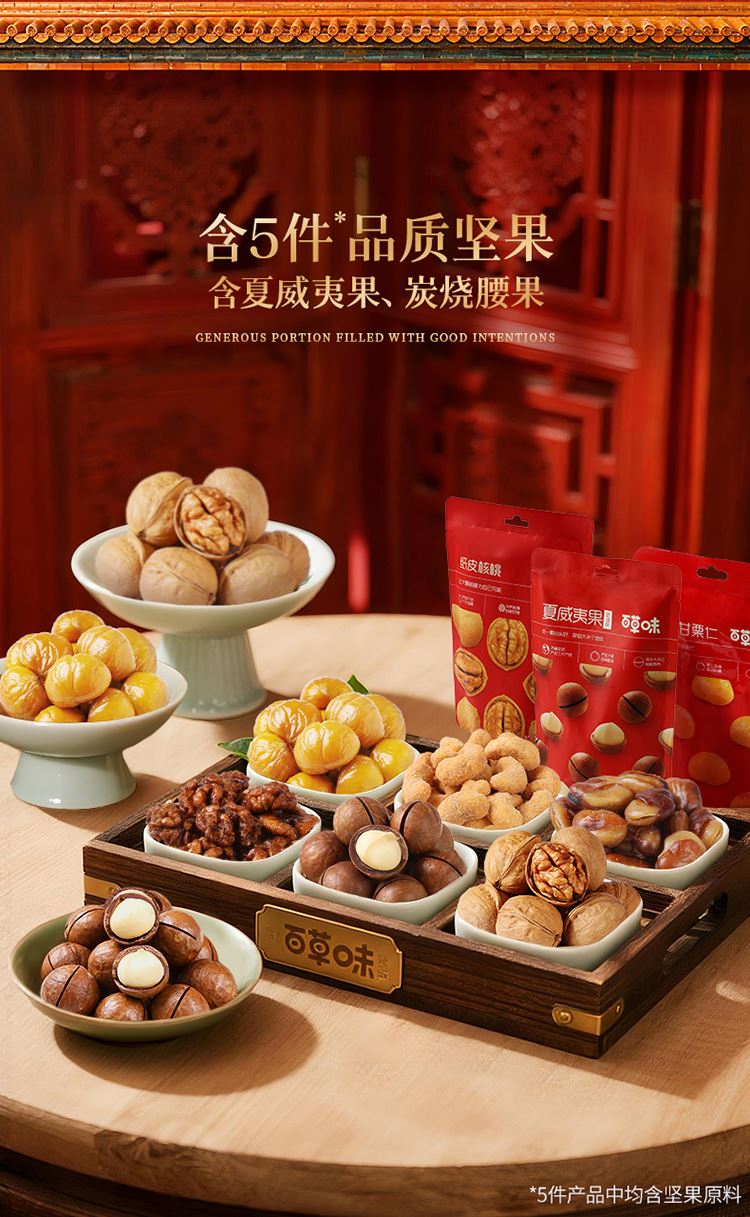 【百草味】炭烧腰果50g 【百草味】夏威夷果60g(奶油味) 【百草味】蜂蜜琥珀核桃仁 100g 【百草味】纸皮核桃128g 【百草味】熟制板栗仁40g 【百草味】爆汁卤花生228g 【百草味】兰花豆(盐焗味)70g 【百草味】小圆饼干(海盐味)100g 【百草味】阿胶蜜枣50g 【百草味】山药脆片(香葱味) 45g 【百草味】每日坚果植物蛋白饮料330g*2