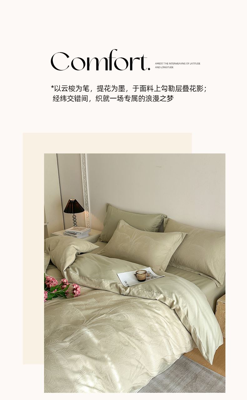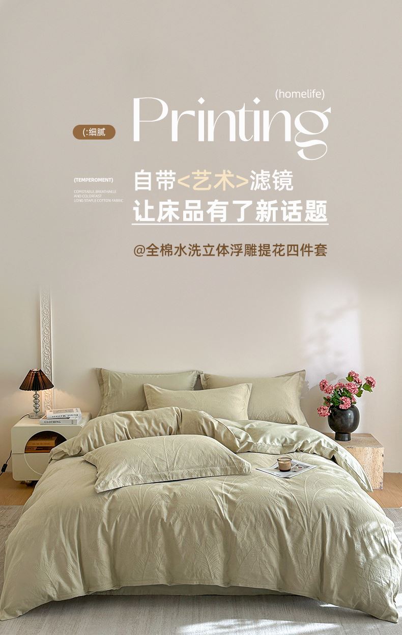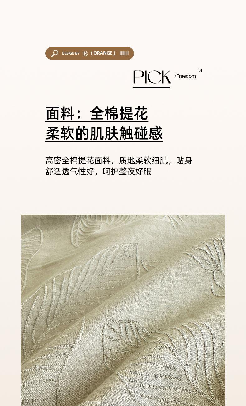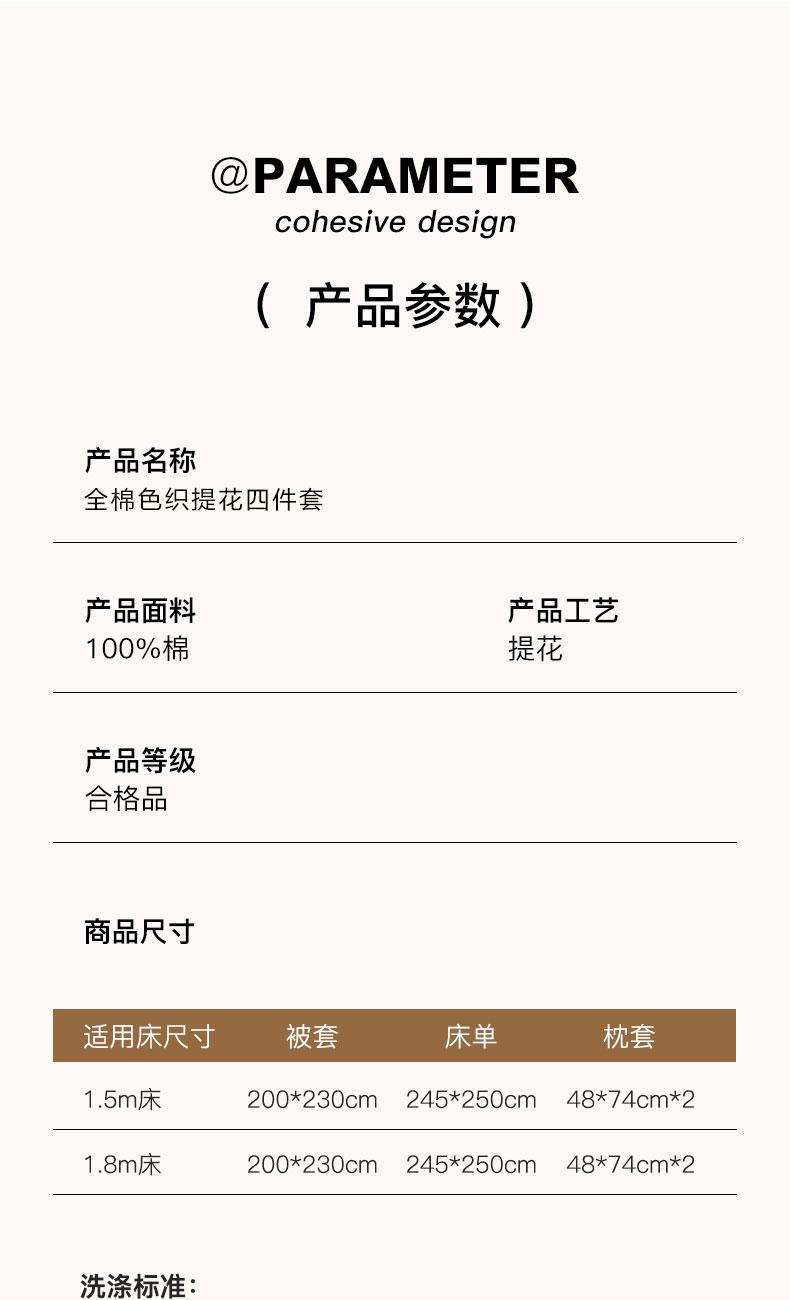 被套:200×230cm 床单:230×245cm 枕套:48×74cm 适用:1.5M-1.8M床 面料:棉 风格:无印风格 包装:精美礼盒 甄选全棉色织面料,触感柔滑细腻感知好睡眠感受每一次接触带来的柔软体验,浪漫浮雕提花工艺契合现代人的审美。AB双版精心搭配的版型设计给床品增添层次愈睡愈爱