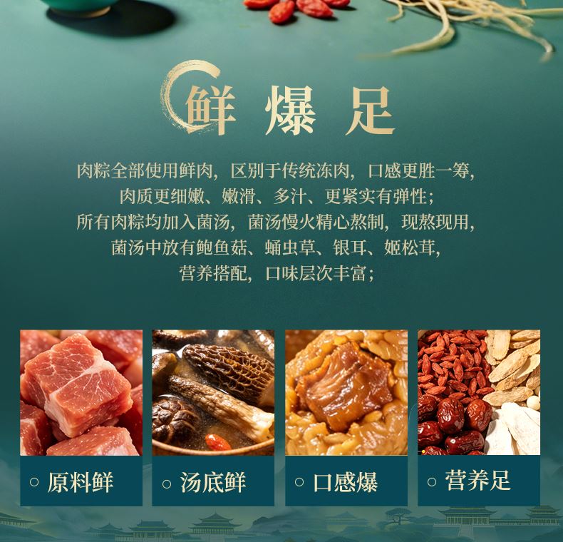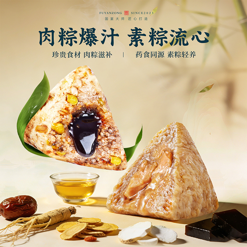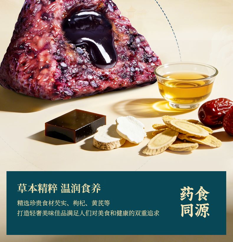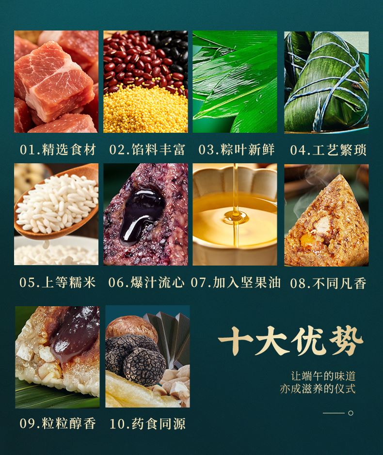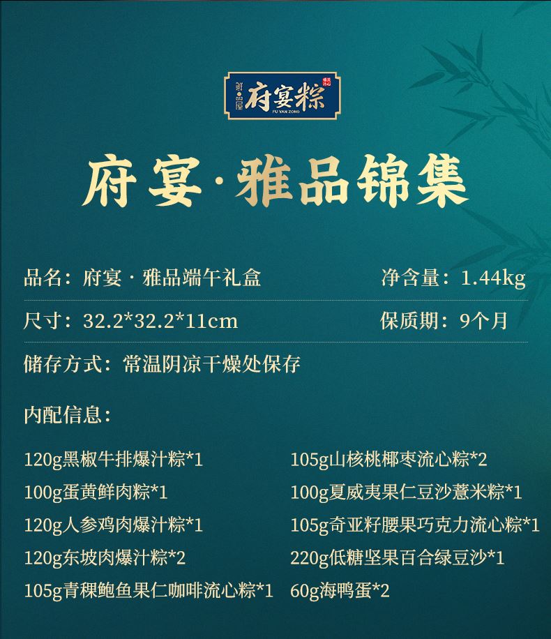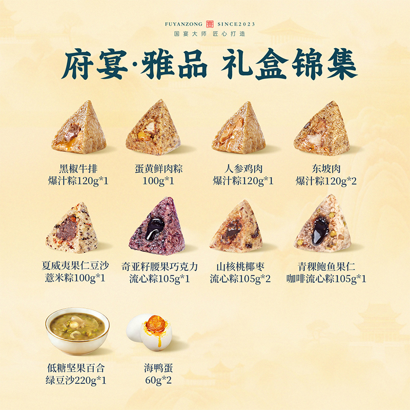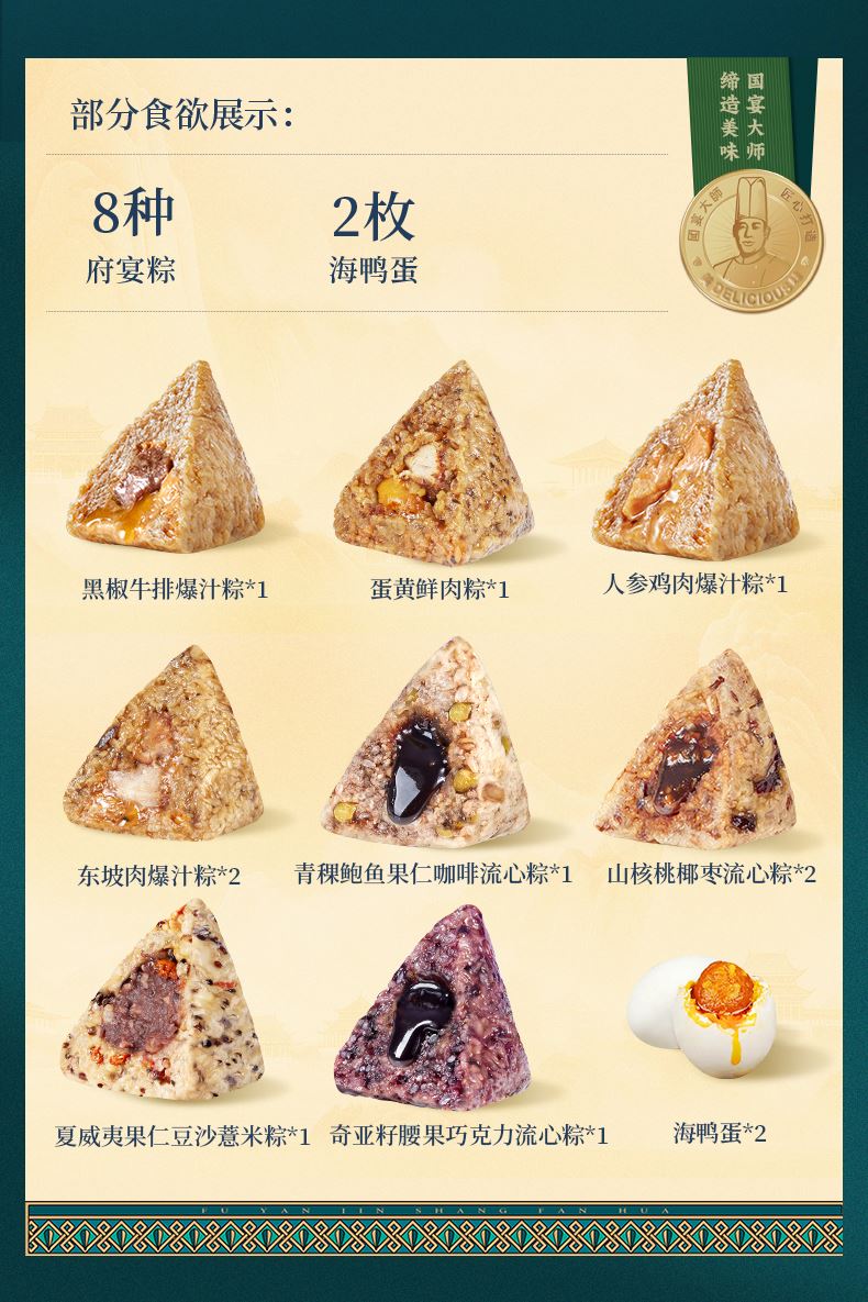 120g黑椒牛排爆汁粽*1 100g蛋黄鲜肉粽*1 120g人参鸡肉爆汁粽*1 120g东坡肉爆汁粽*2 105g青稞鲍鱼果仁咖啡流心粽*1 105g山核桃椰枣流心粽*2 100g夏威夷果仁豆沙薏米粽*1 105g奇亚籽腰果巧克力流心粽*1 220g低糖坚果百合绿豆沙*1 60g海鸭蛋*2