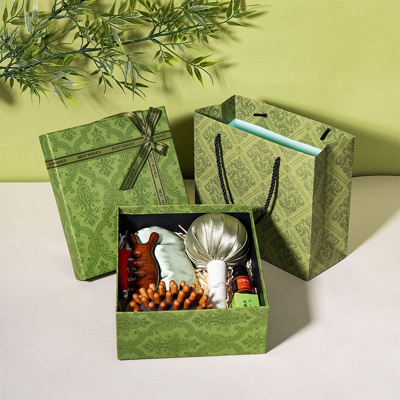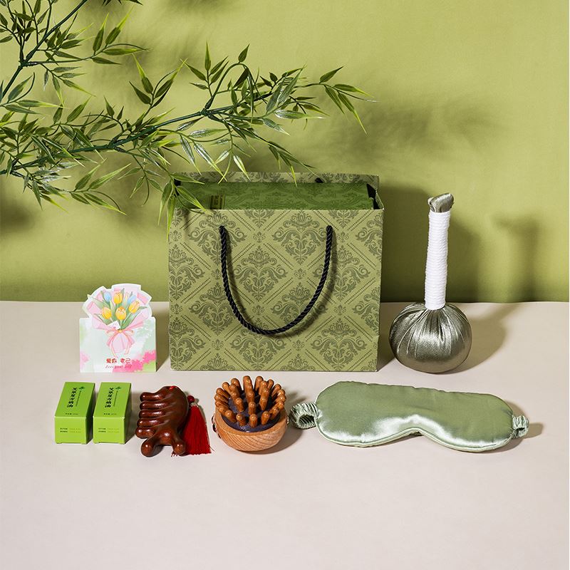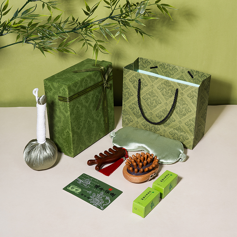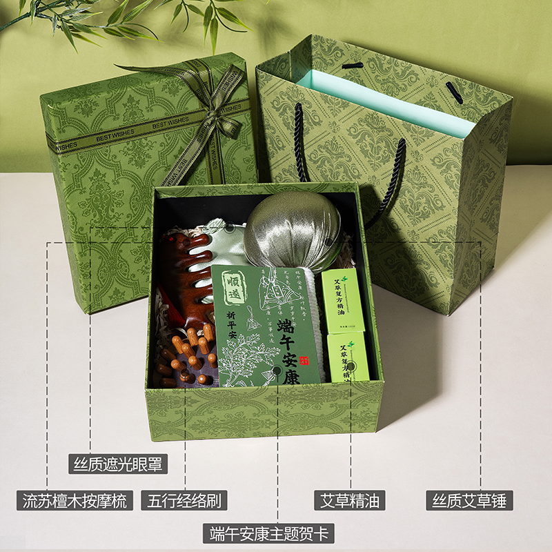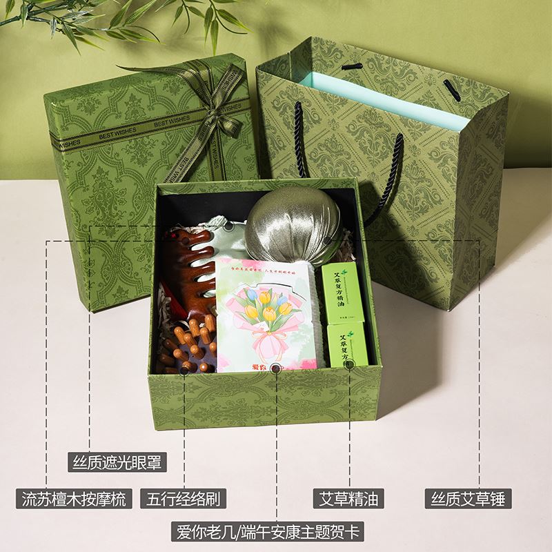 1、精品绿色国潮风礼盒,搭配同风格手提袋,大气上档次,适合商务、福利、礼赠渠道。 2、一份好礼,按摩全身,舒筋通络,守护客户四时安康。 3、丝质艾草锤,疏通经络,锤出安康;丝质遮光眼罩,亲肤助眠,滑溜溜睡个好觉;古风流苏檀木按摩梳,精美流苏,颜值爆表,按摩梳头两不误;五行经络刷,通经络,按摩瘦身神器;艾草精油,按摩前涂一涂,效果加倍。 4、按摩通经络,实用好礼就这一套。 5、可根据客户需求选配爱你老几/端午安康主题贺卡,满满的仪式感和情绪价值。