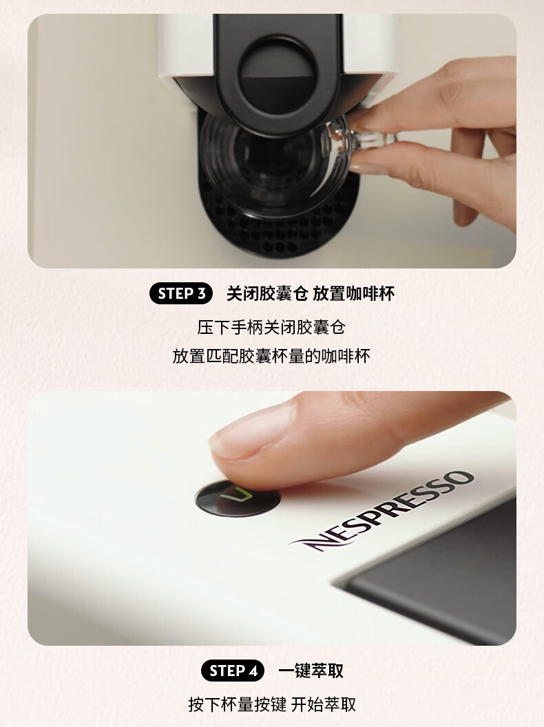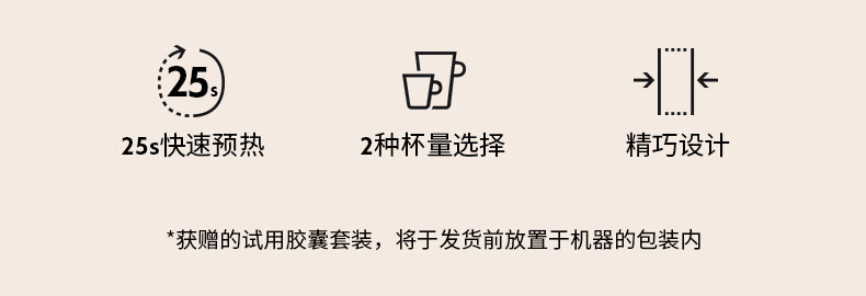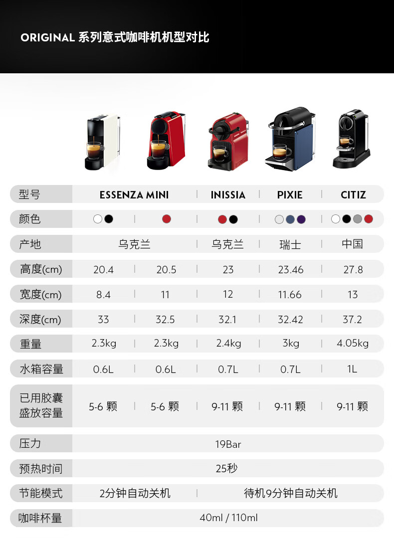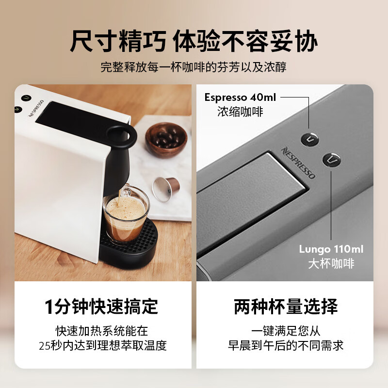 认证型号:C30 电源线长:0.78m 额定电压:220V 额定功率:1200W 产品尺寸:长330mm 宽84mm 高204mm 水箱容量:0.6-1.29L 制作口味:卡布奇诺 拿铁 意式浓缩 稳定高压萃取技术,充分释放香气;尺寸精巧体验不容妥协;汇集了 NESPRESSO的专业萃取技术能够完整释放每一杯咖啡的芬芳以及浓醇