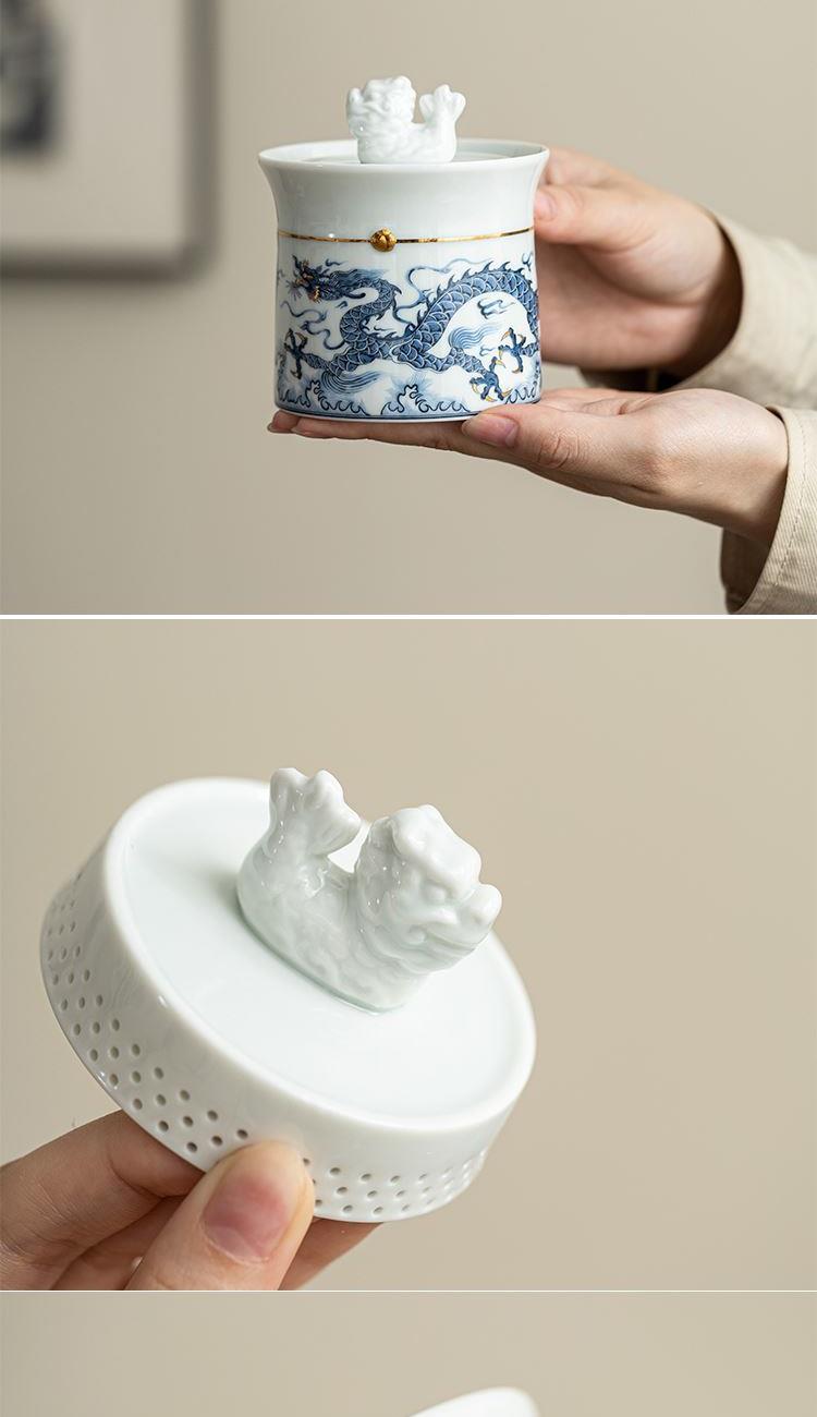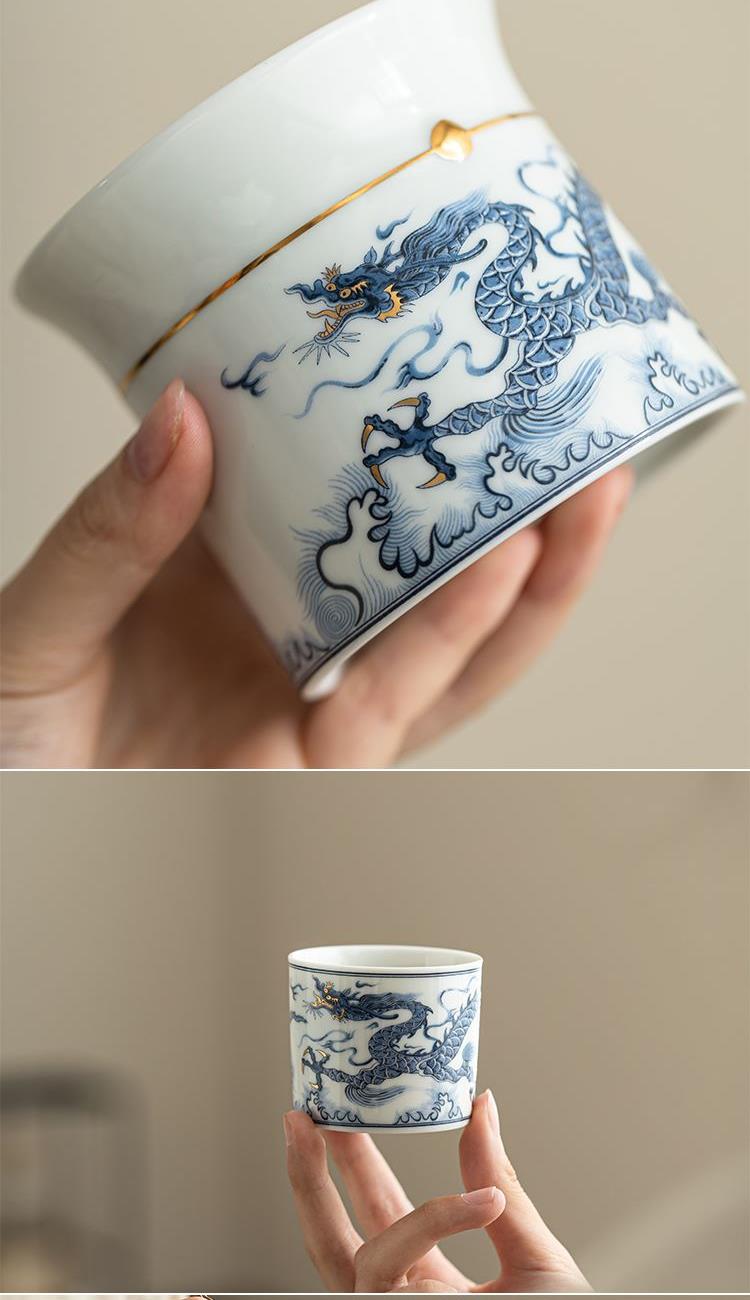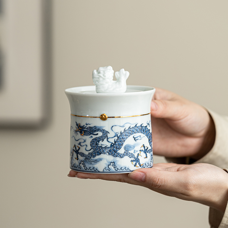 龙腾四海快客杯,觚形壶身,高腰束身,足立四方,尽显稳重和大气。壶身鎏金的球形腰束,使器件更为富丽和精神。龙盖钮更是龙行龘龘,寄意朤朤前程。壶及品杯搭配以元青花龙为主要元素的图纹做为装饰,使器件处处流露出恢宏的气势。纵观快客杯套件,不仅美观,更蕴含着丰富的历史人文底蕴。 配置:元青花茶壶*1、茶杯*2、赠粽子*2(100g*2))、 赠正山小种*6罐、冷烫工艺礼盒、礼袋