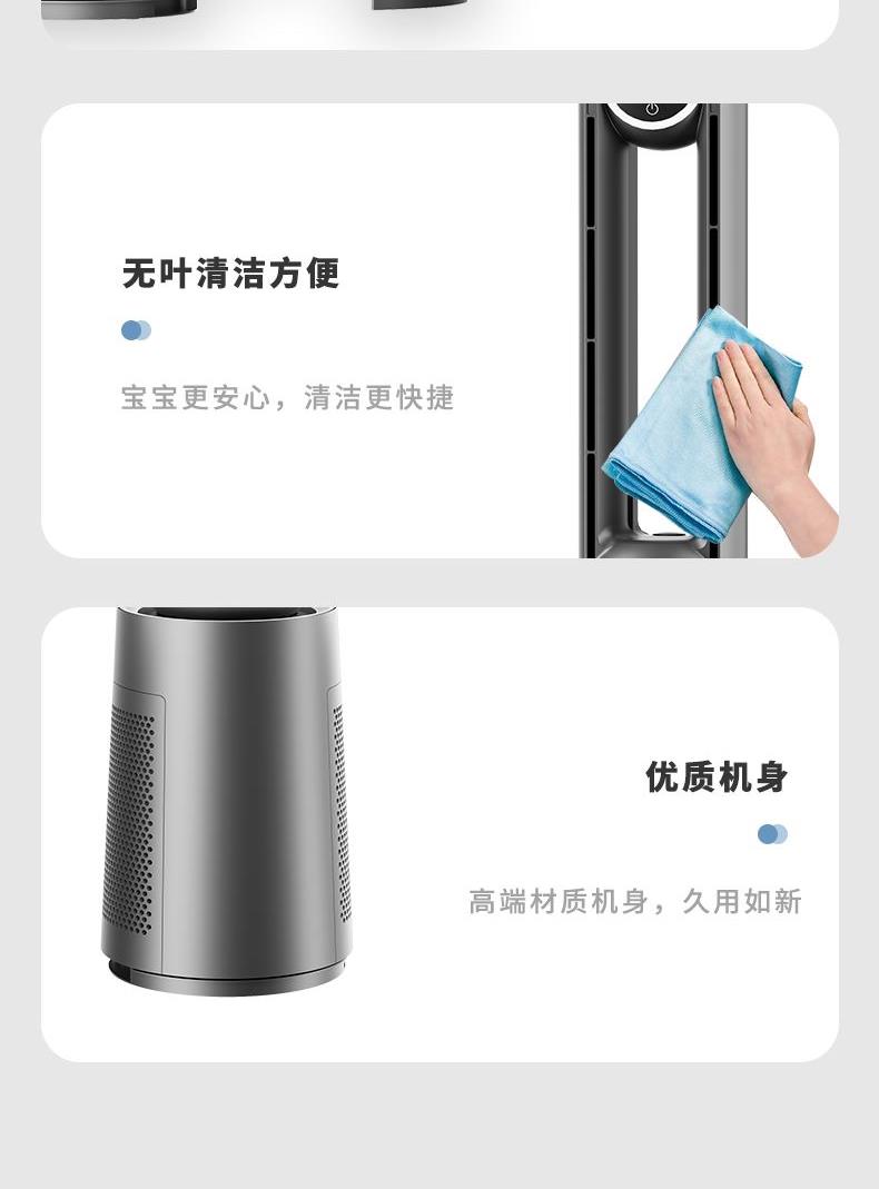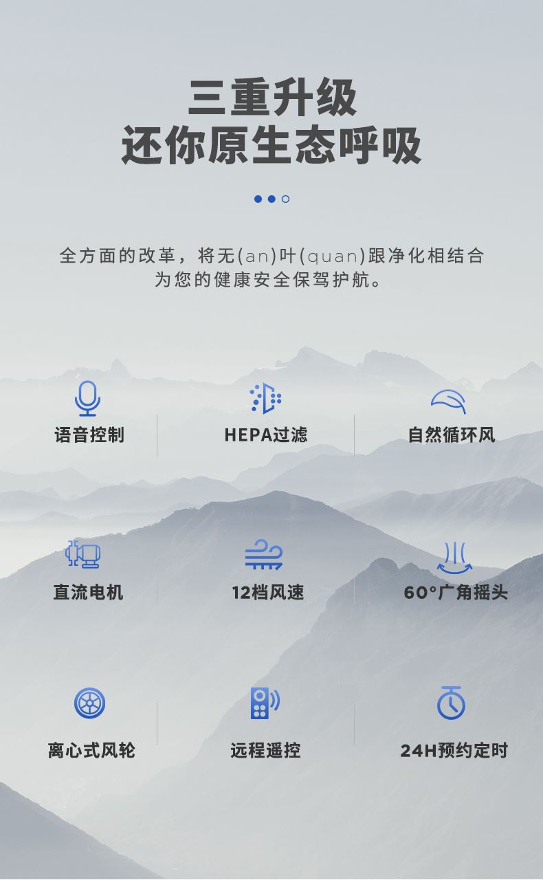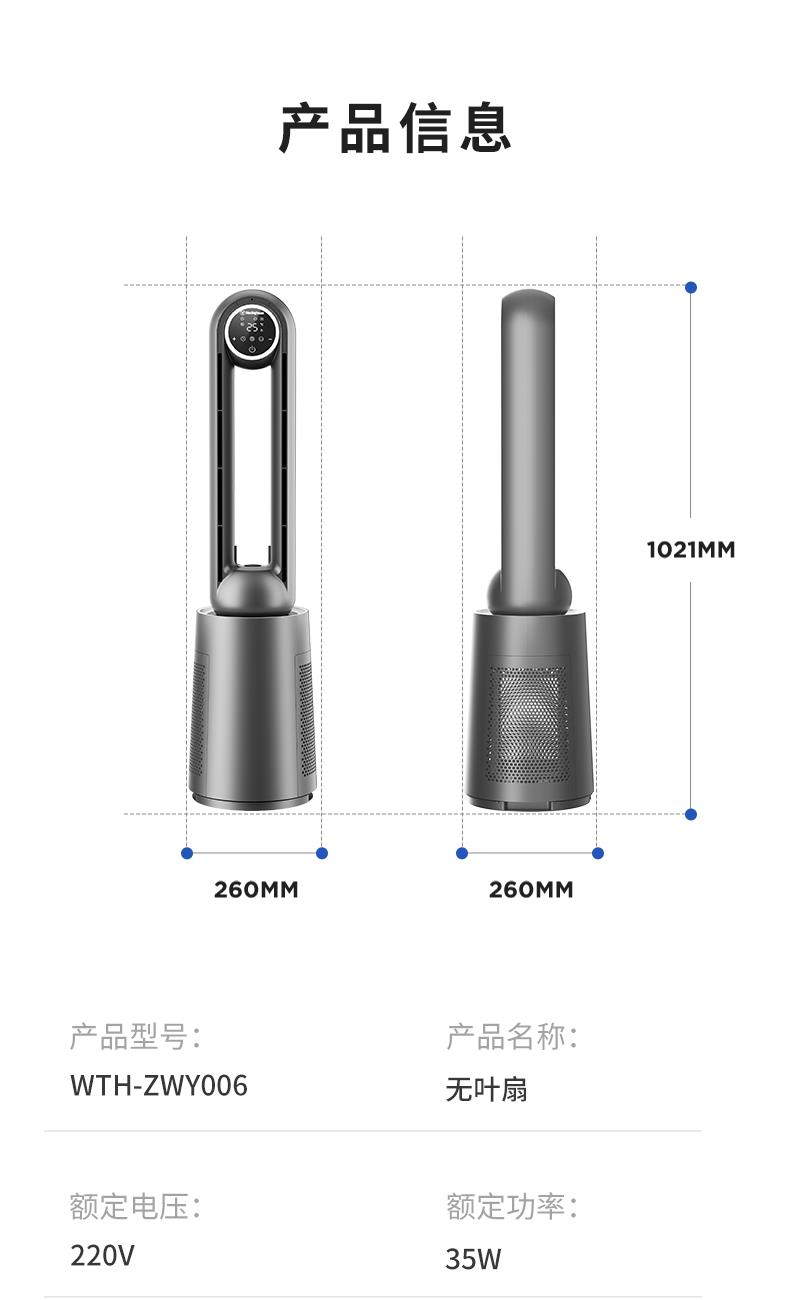 型号:WTH-ZWY006 功率:35W 控制方式:智慧语音/遥控/触屏 风速档位:12档 产品尺寸:260*260*1021mm 纳米UV、HEPA吸附过滤 直流无刷电机 AI智慧语音控制 雾化加湿 12档风速调节