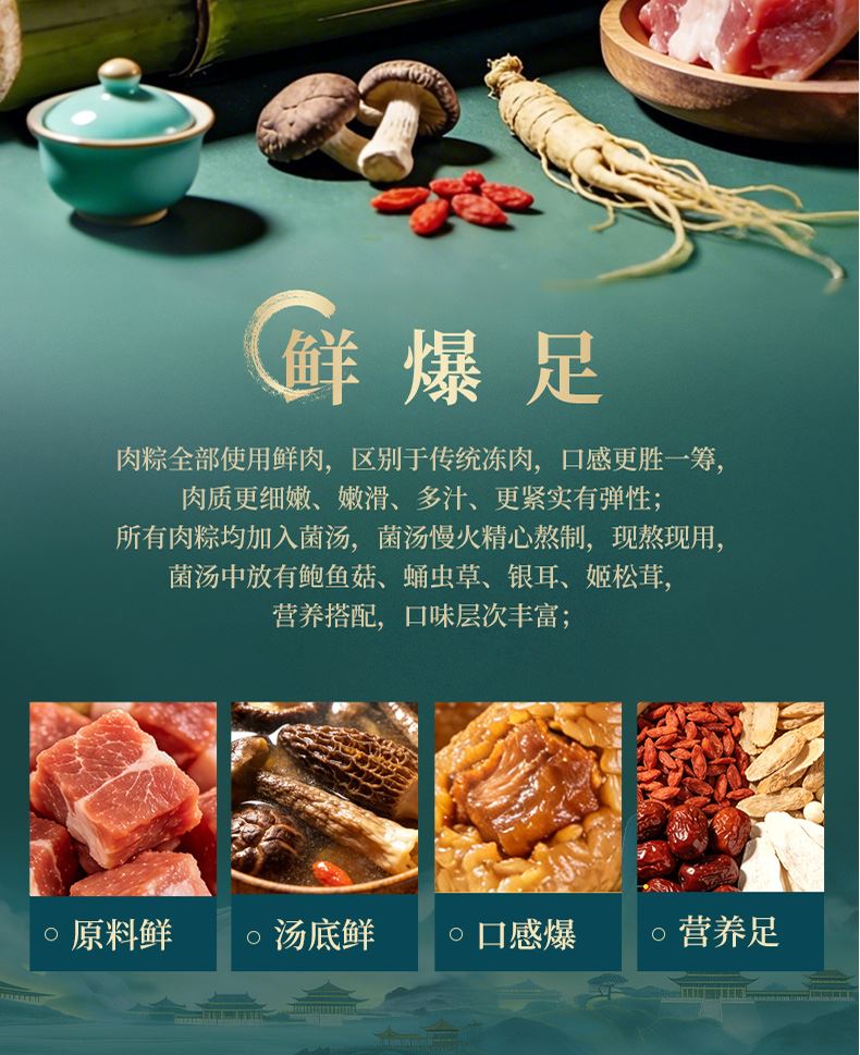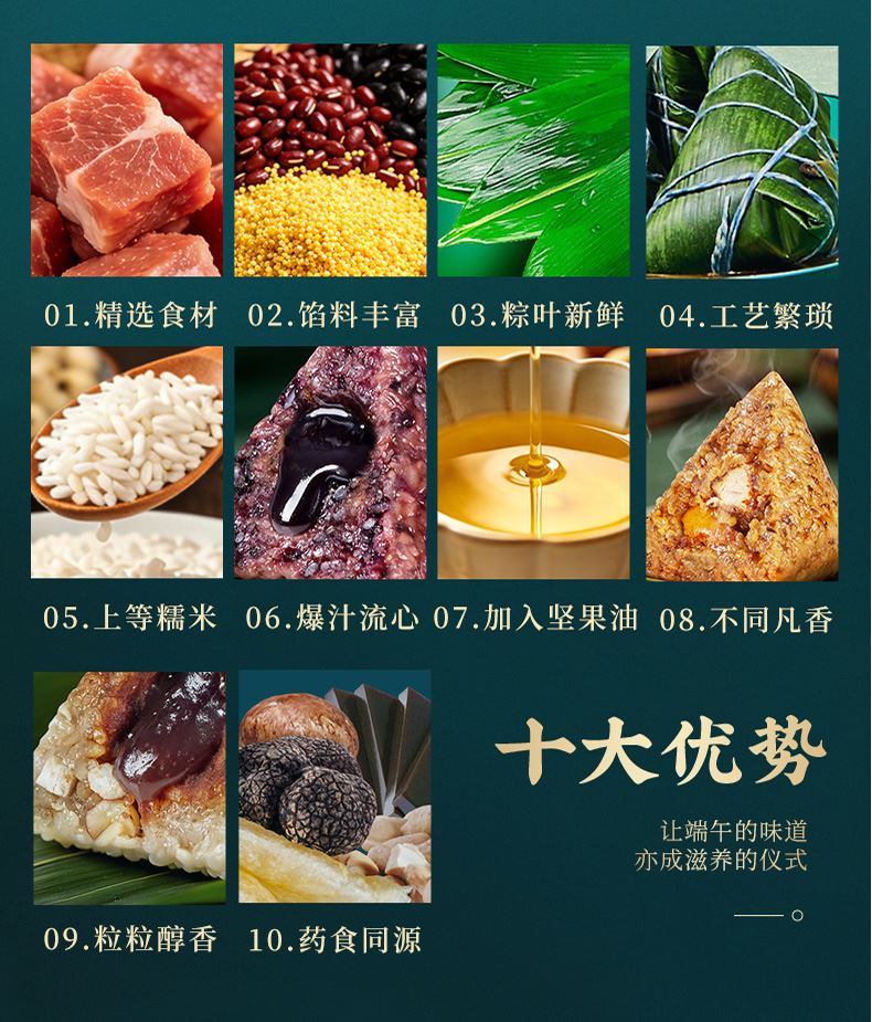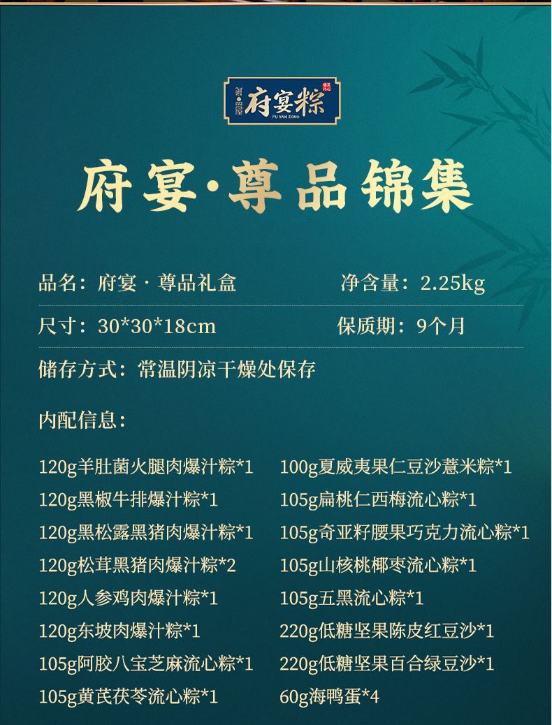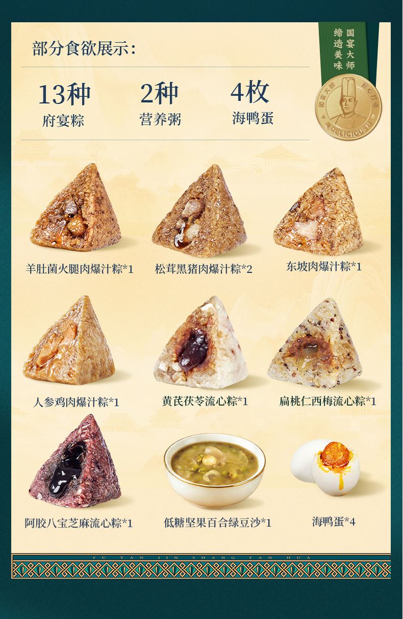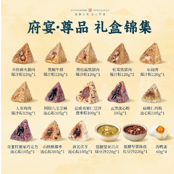 120g羊肚菌火腿肉爆汁粽*1 120g黑椒牛排爆汁粽*1 120g黑松露黑猪肉爆汁粽*1 120g松茸黑猪肉爆汁粽*2 120g人参鸡肉爆汁粽*1 120g东坡肉爆汁粽*1 105g阿胶八宝芝麻流心粽*1 105g黄芪茯苓流心粽*1 100g夏威夷果仁豆沙薏米粽*1 105g扁桃仁西梅流心粽*1 105g奇亚籽腰果巧克力流心粽*1 105g山核桃椰枣流心粽*1 105g五黑流心粽*1 220g低糖坚果陈皮红豆沙*1 220g低糖坚果百合绿豆沙*1 60g海鸭蛋*4