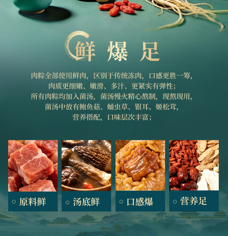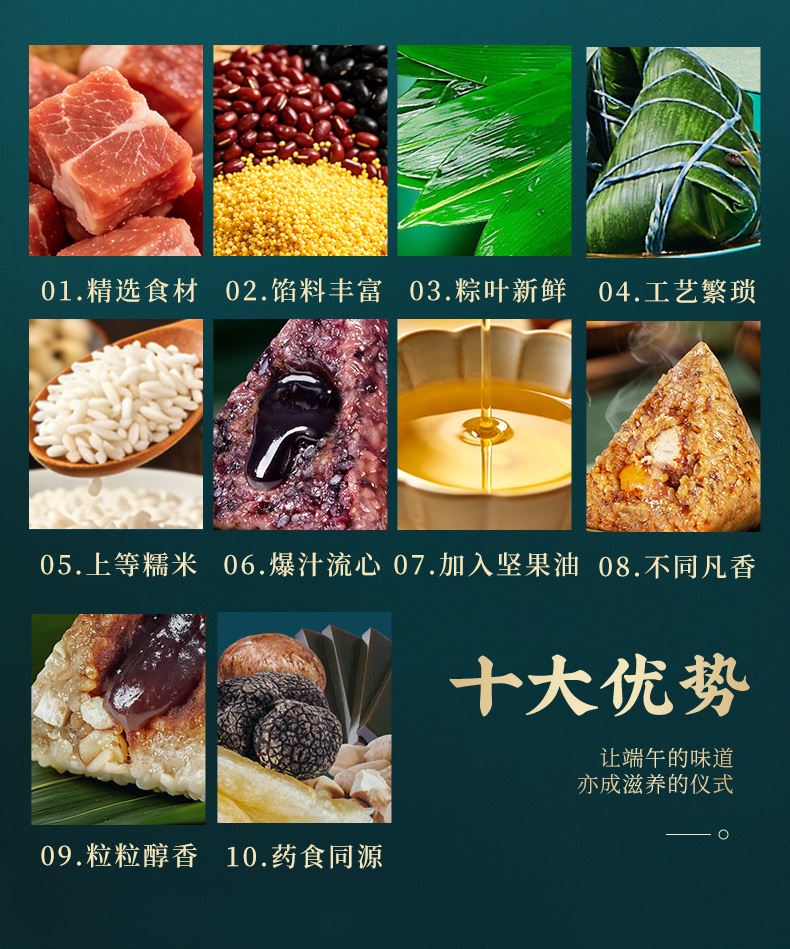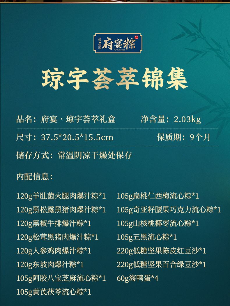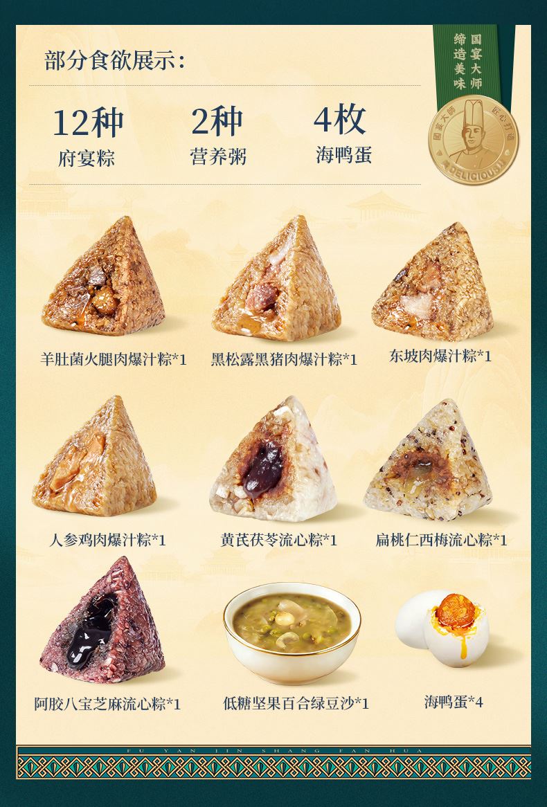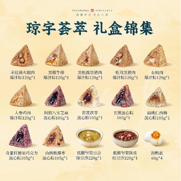 120g羊肚菌火腿肉爆汁粽*1 120g黑松露黑猪肉爆汁粽*1 120g黑椒牛排爆汁粽*1 120g松茸黑猪肉爆汁粽*1 120g人参鸡肉爆汁粽*1 120g东坡肉爆汁粽*1 105g阿胶八宝芝麻流心粽*1 105g黄芪茯苓流心粽*1 105g扁桃仁西梅流心粽*1 105g奇亚籽腰果巧克力流心粽*1 105g山核桃椰枣流心粽*1 105g五黑流心粽*1 220g低糖坚果陈皮红豆沙*1 220g低糖坚果百合绿豆沙*1 60g海鸭蛋*4