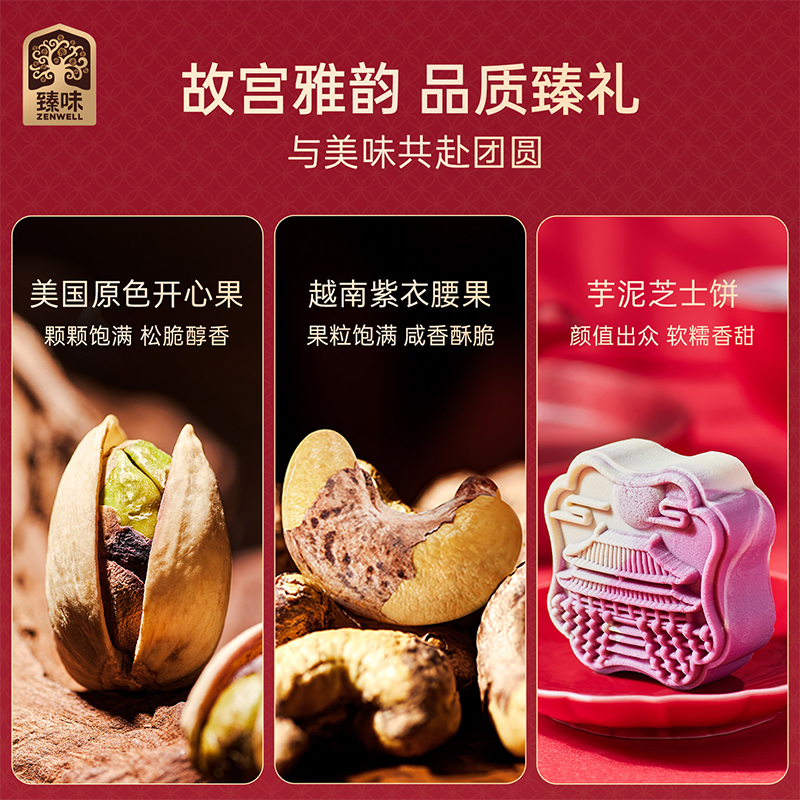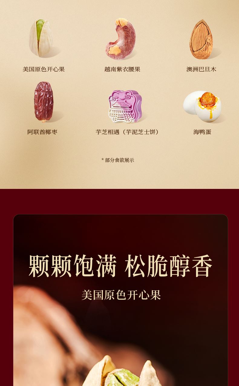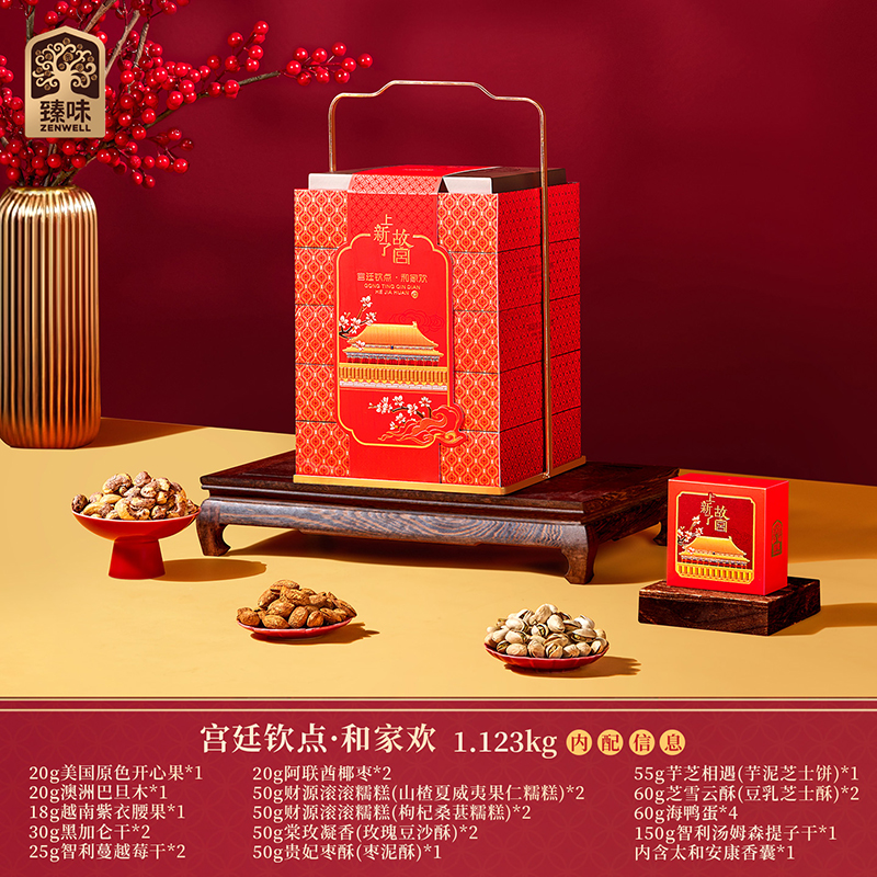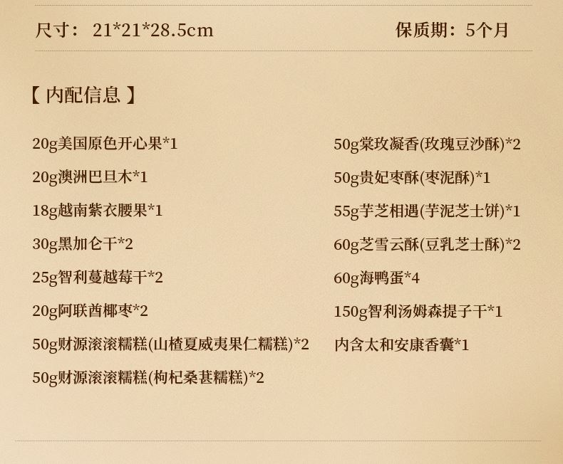 20g美国原色开心果*1 20g澳洲巴旦木*1 18g越南紫衣腰果*1 30g黑加仑干*2 25g智利蔓越莓干*2 20g阿联酋椰枣*2 50g财源滚滚糯糕(山楂夏威夷果仁糯糕)*2 50g财源滚滚糯糕(枸杞桑葚糯糕)*2 50g棠玫凝香(玫瑰豆沙酥)*2 50g贵妃枣酥(枣泥酥)*1 55g芋芝相遇(芋泥芝士饼)*1 60g芝雪云酥(豆乳芝士酥)*2 60g海鸭蛋*4 150g智利汤姆森提子干*1 赠品-太和安康香囊*1