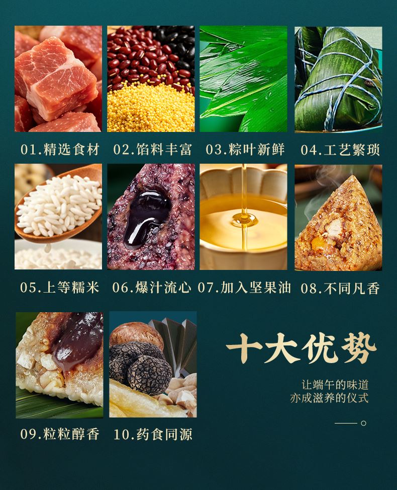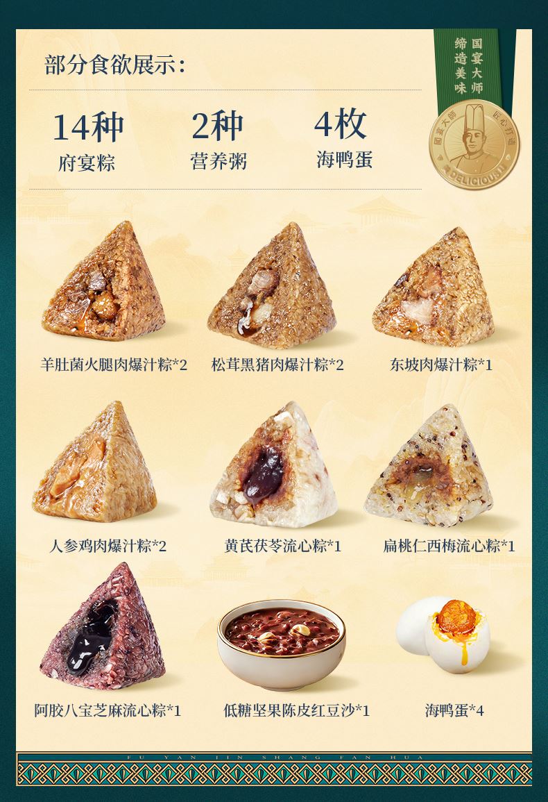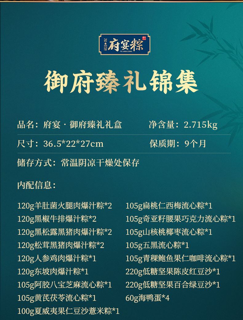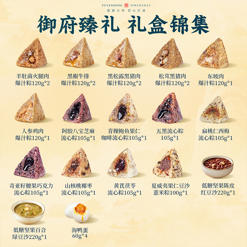 120g羊肚菌火腿肉爆汁粽*2 120g黑椒牛排爆汁粽*2 120g黑松露黑猪肉爆汁粽*2 120g松茸黑猪肉爆汁粽*2 120g人参鸡肉爆汁粽*1 120g东坡肉爆汁粽*1 105g阿胶八宝芝麻流心粽*1 105g黄芪茯苓流心粽*1 100g夏威夷果仁豆沙薏米粽*1 105g扁桃仁西梅流心粽*1 105g奇亚籽腰果巧克力流心粽*1 105g山核桃椰枣流心粽*1 105g五黑流心粽*1 105g青稞鲍鱼果仁咖啡流心粽*1 220g低糖坚果陈皮红豆沙*1 220g低糖坚果百合绿豆沙*1 60g海鸭蛋*4