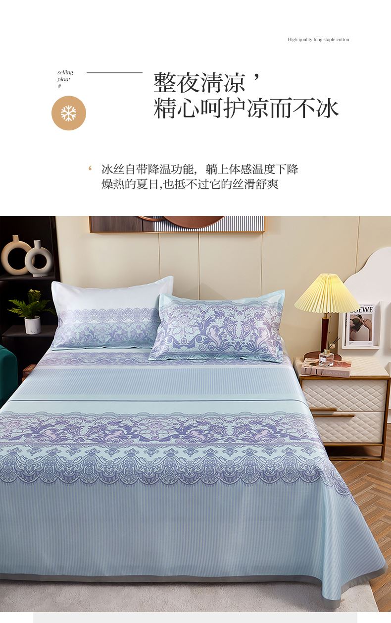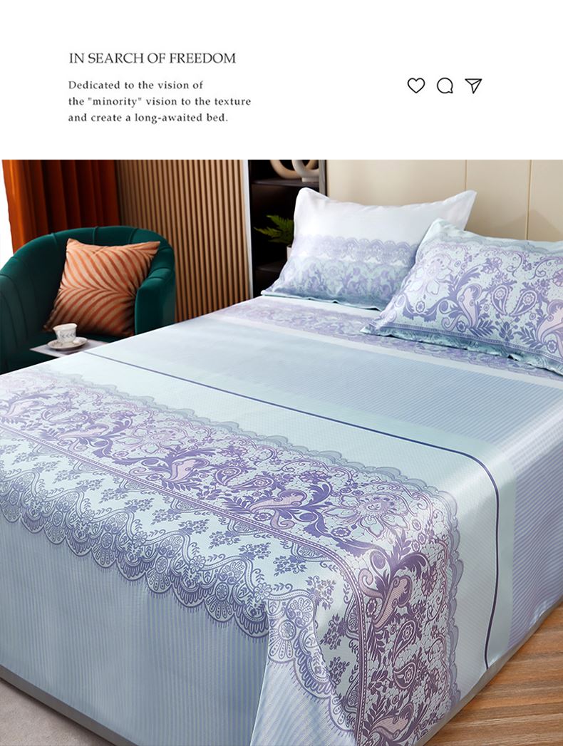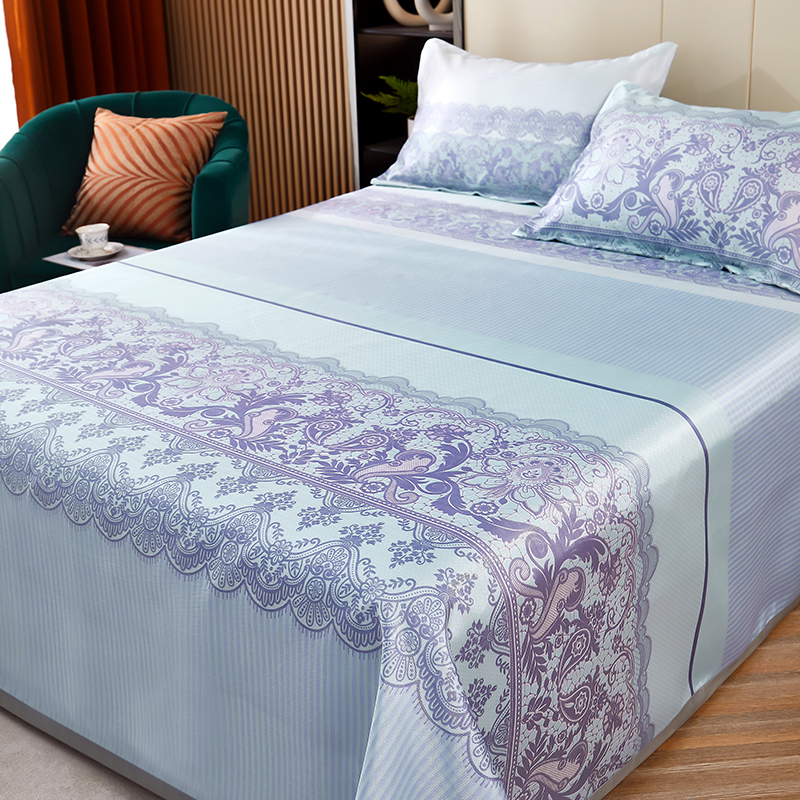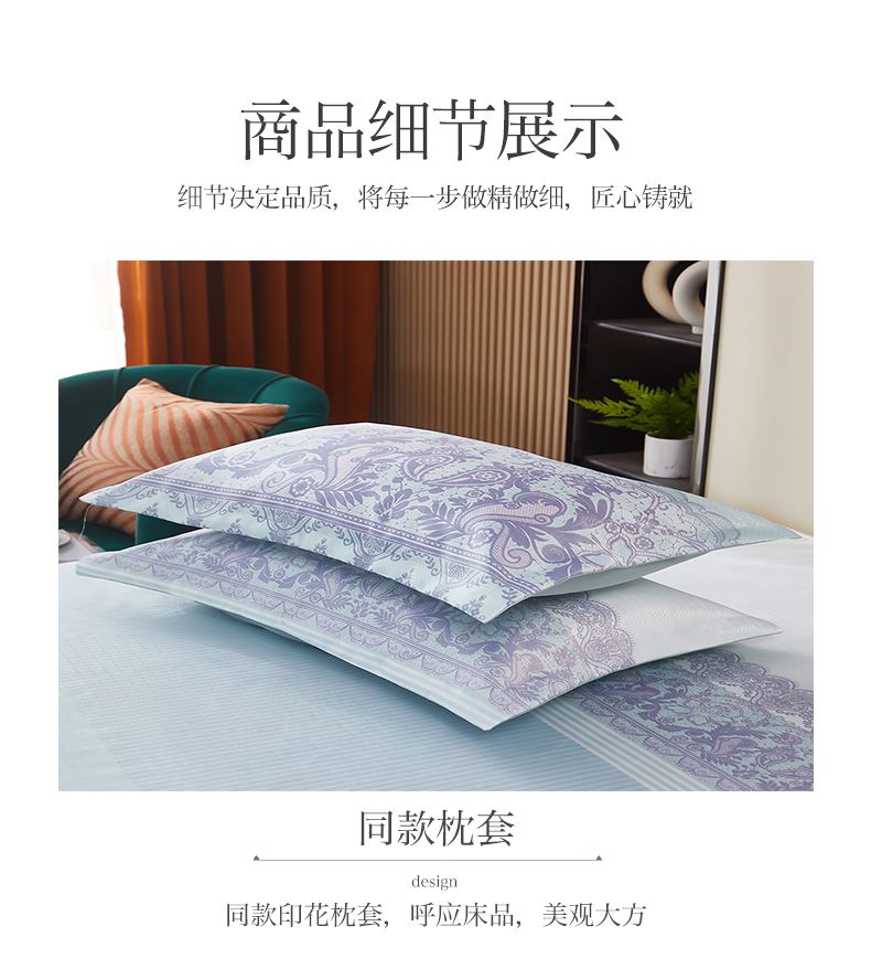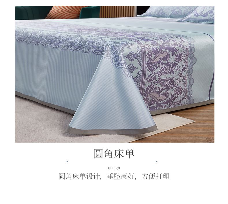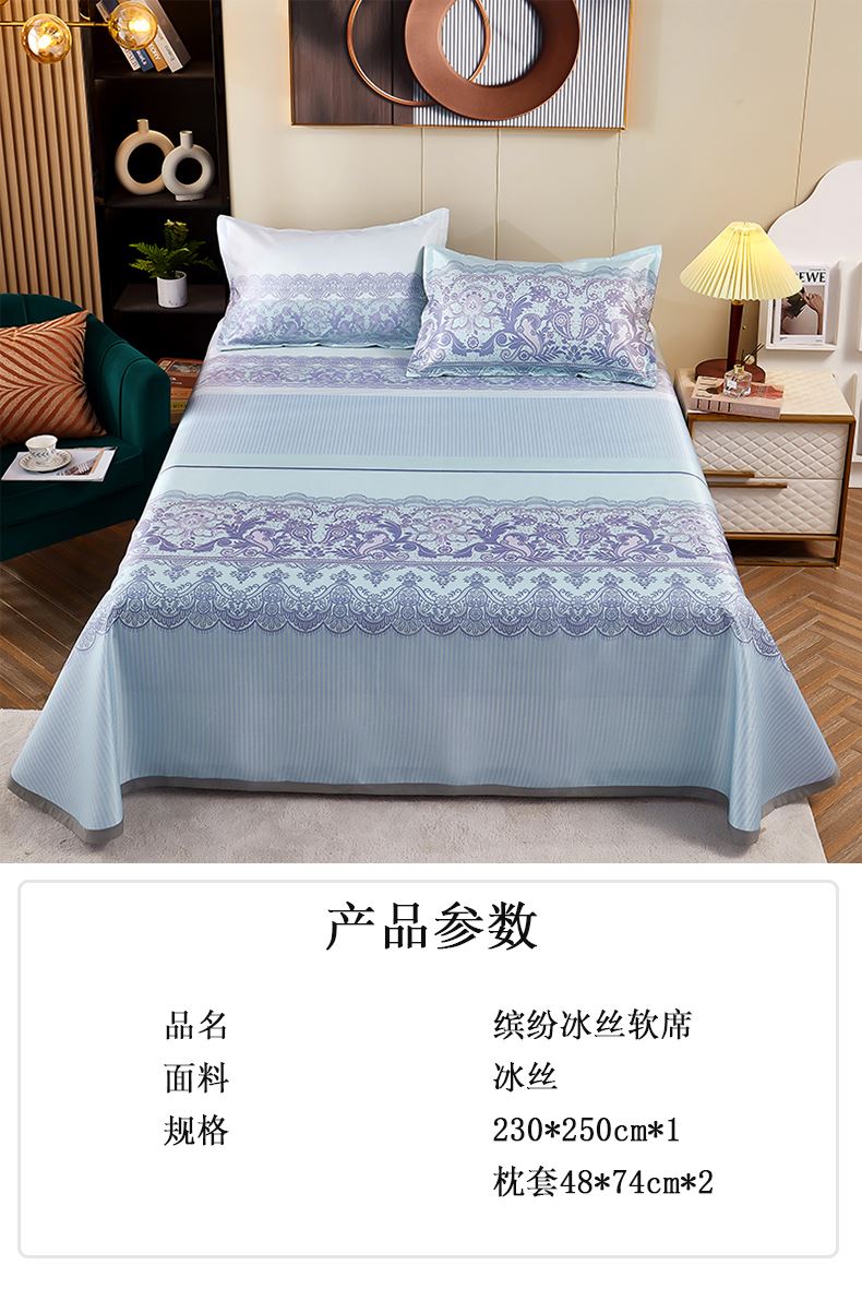 规格:230*250cm*1 枕套:48*74cm*2 面料:冰丝提花 工艺:活性印染 产品特点: 1.选用冰丝纤维,机洗、折叠不变形。 2.编织密度大,不易变形不易滑落。 3.物理凉感,凉而不冰,提花色织工艺,久用如新。 4.精美图案,无甲醛,健康环保。