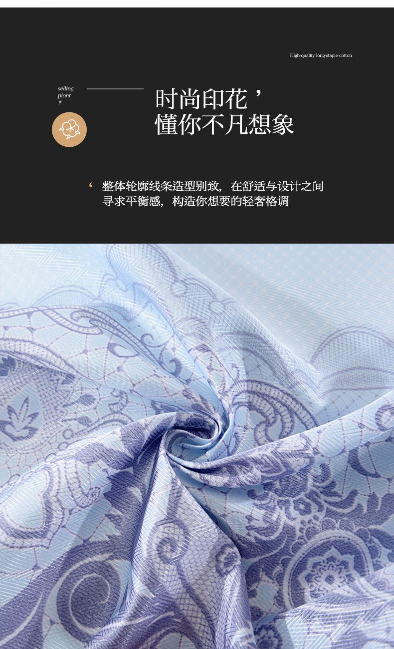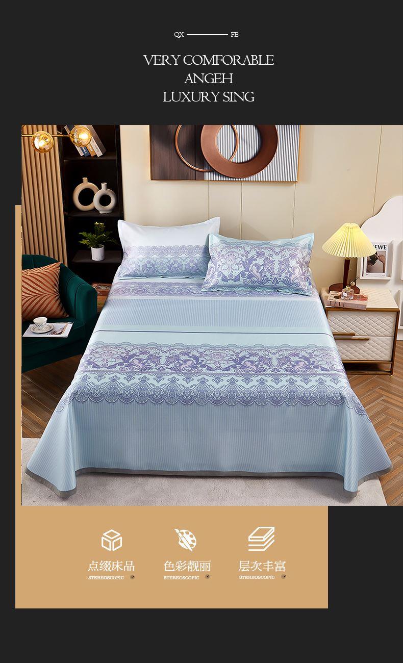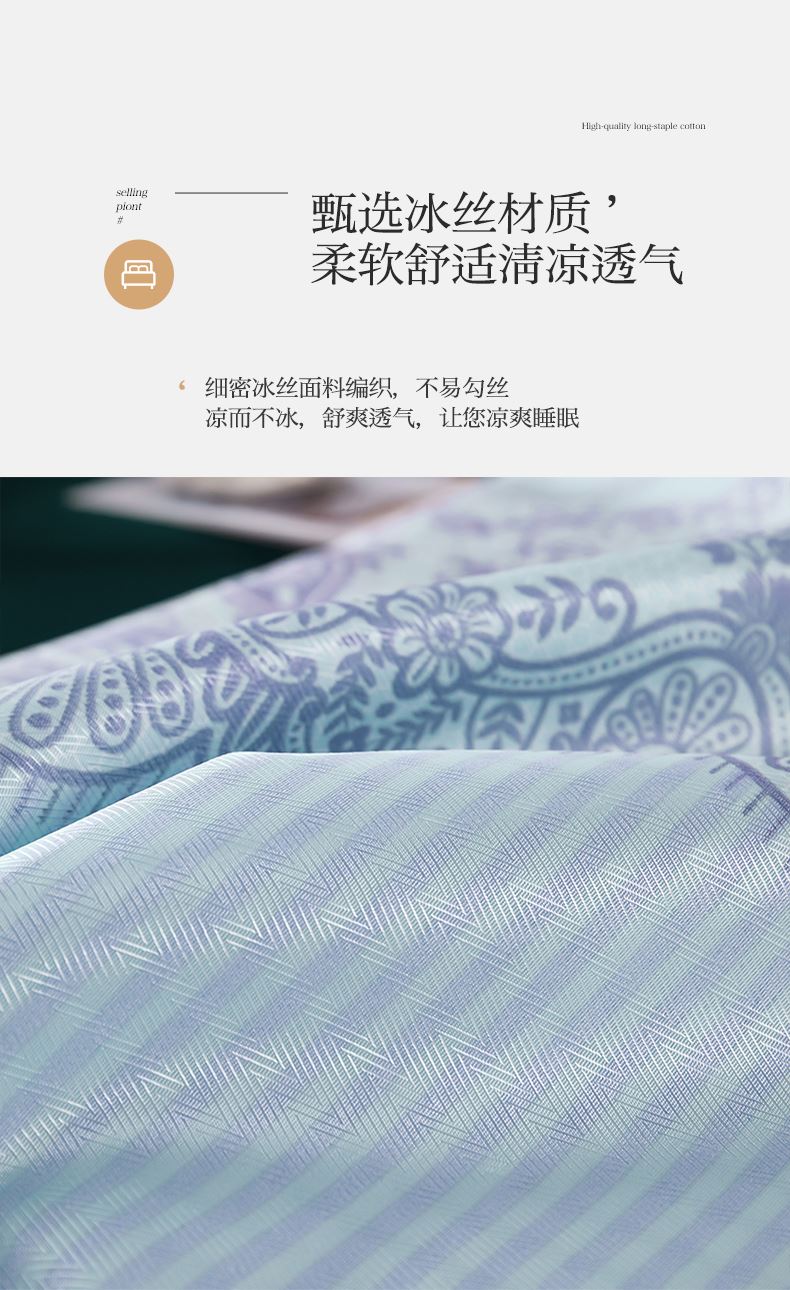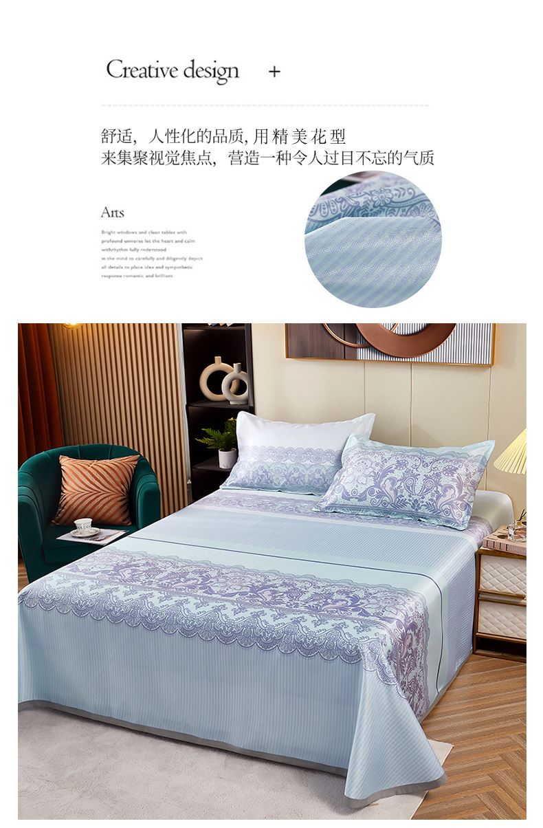规格:230*250cm*1 枕套:48*74cm*2 面料:冰丝提花 工艺:活性印染 产品特点: 1.选用冰丝纤维,机洗、折叠不变形。 2.编织密度大,不易变形不易滑落。 3.物理凉感,凉而不冰,提花色织工艺,久用如新。 4.精美图案,无甲醛,健康环保。