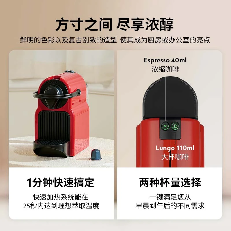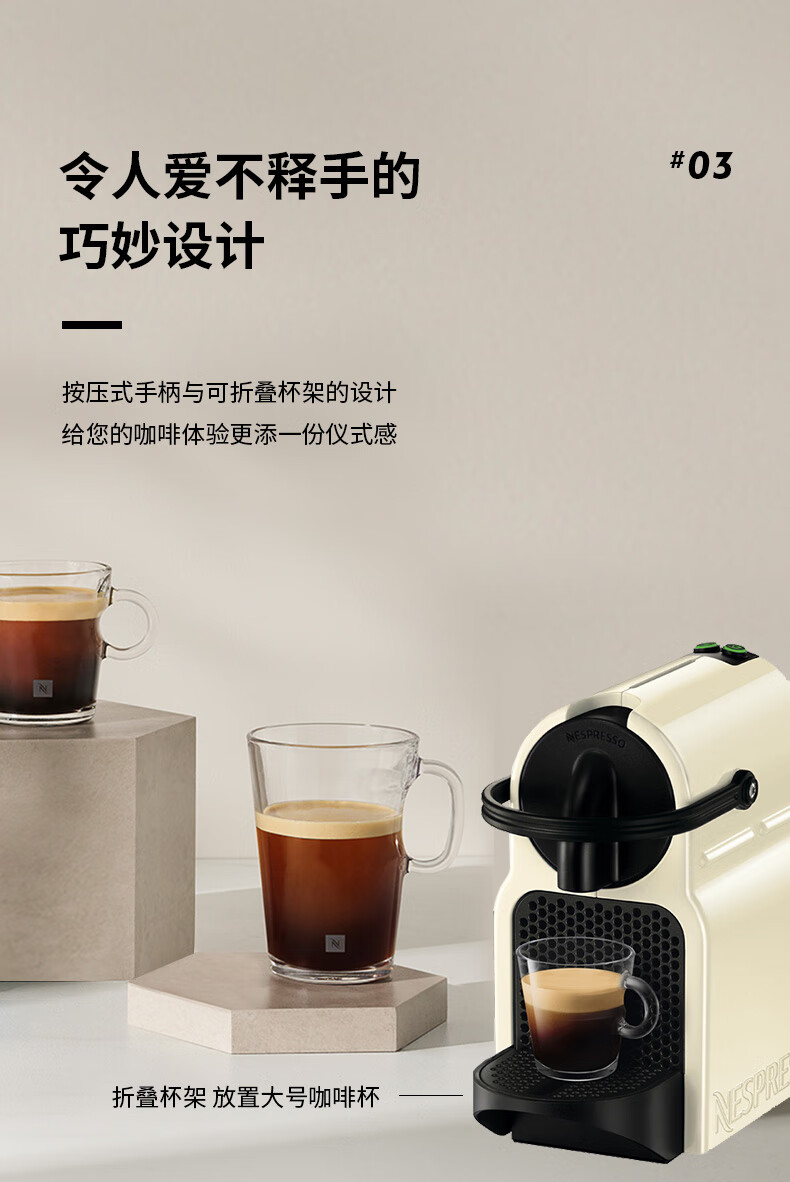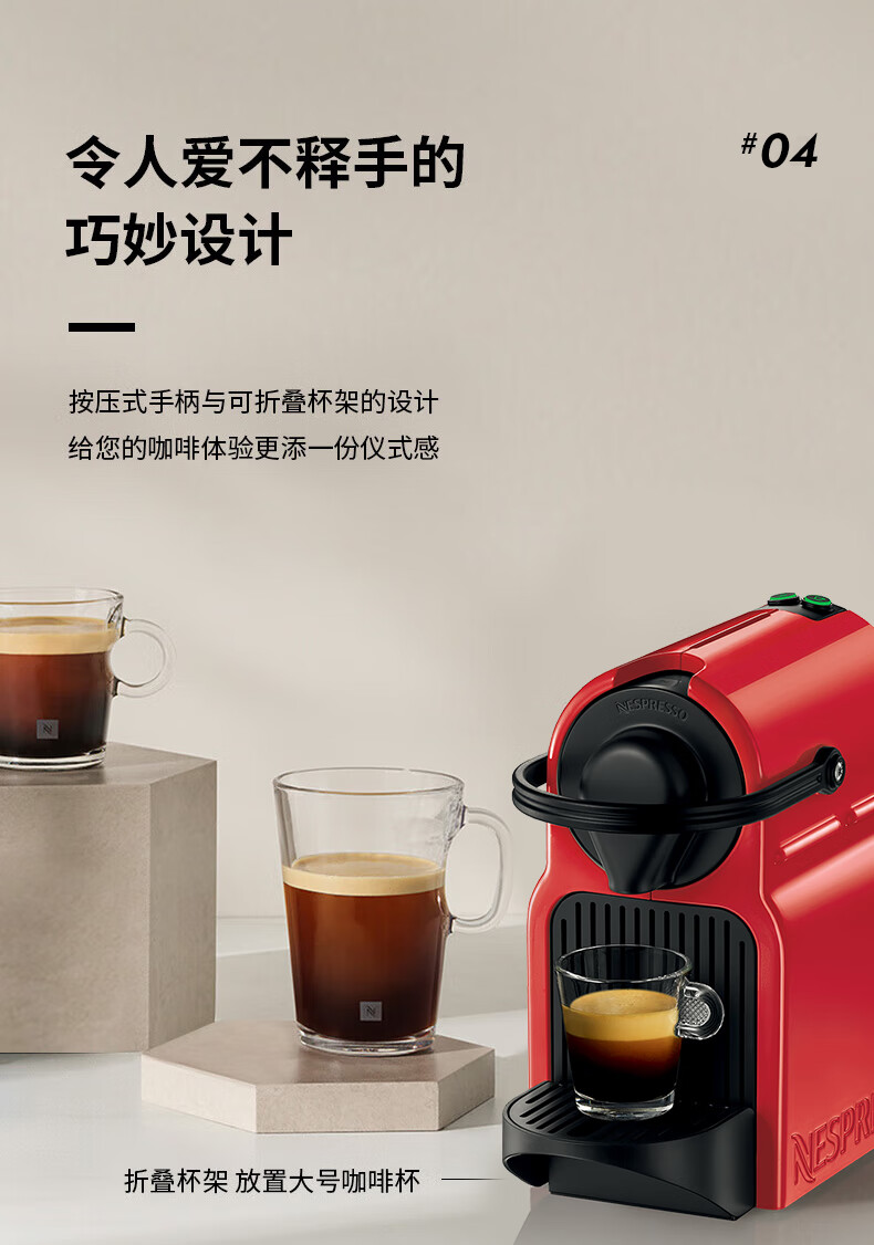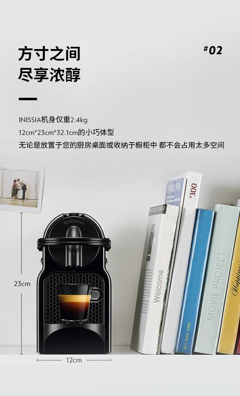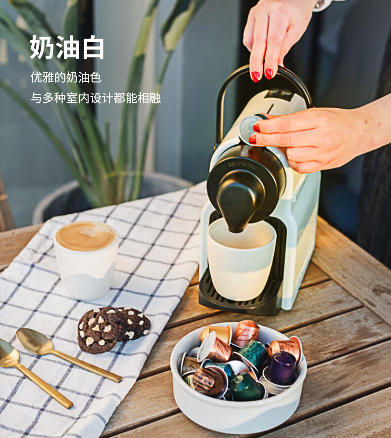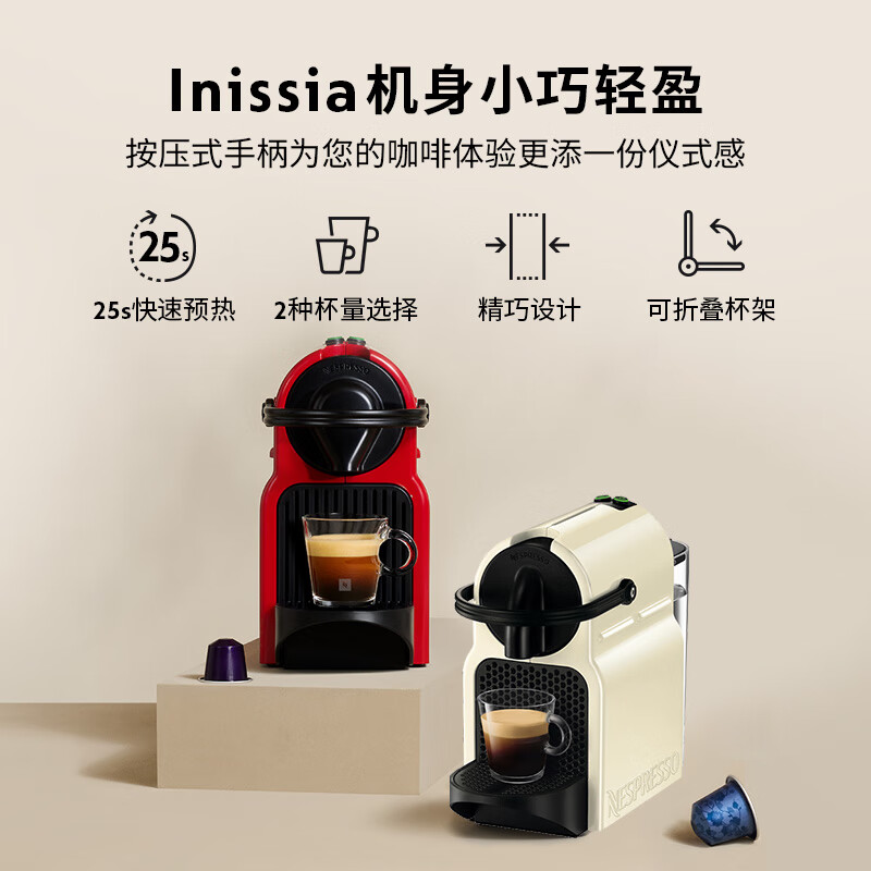 认证型号:D40 电源线长:1.2m 额定电压:220V 额定功率:1500W 产品尺寸:长321mm 宽120mm 高230mm 水箱容量:0.6-1.29L 泵浦压力:19Bar 制作口味:卡布奇诺 拿铁 意式浓缩 19Bar高压萃取系统为完整释放与呈现咖啡中的芬芳而设计;快速预热系统能在25秒内达到理想萃取温度结合NESPRESSO稳定的19Bar高压萃取技术感受INISSIA为您带来的柔滑浓郁油脂