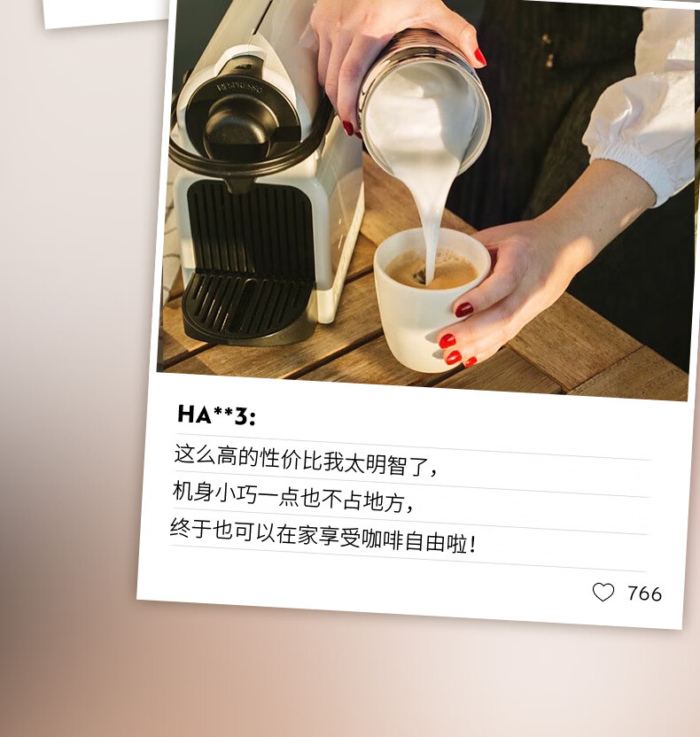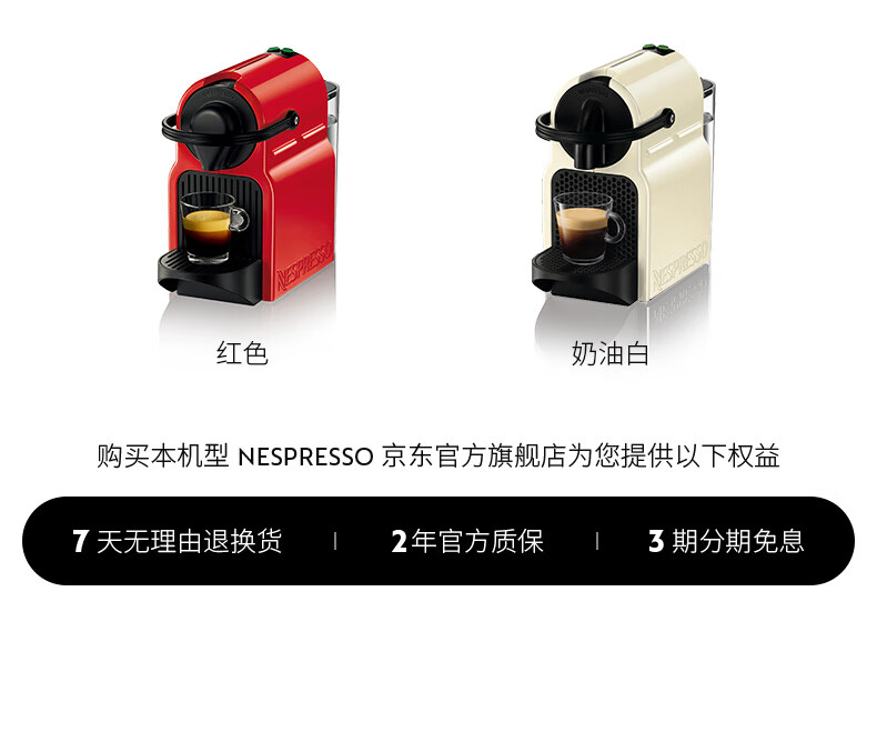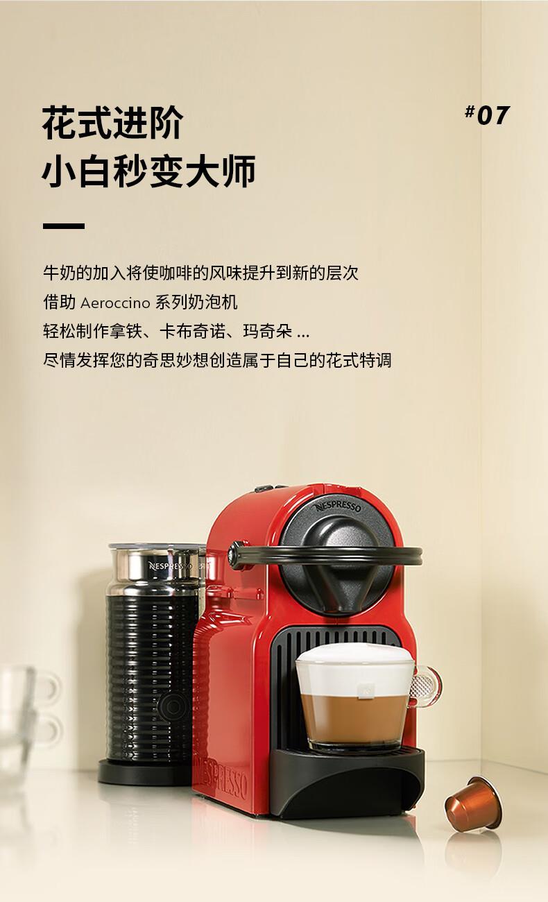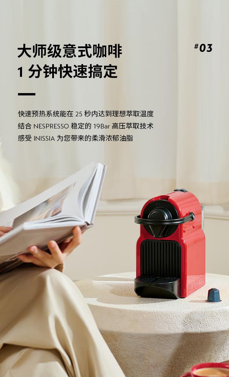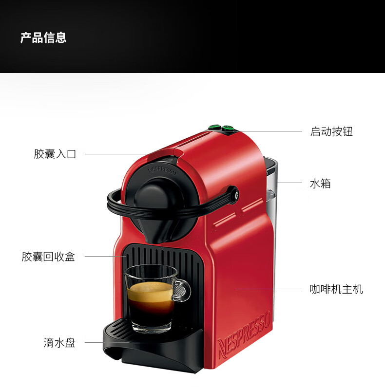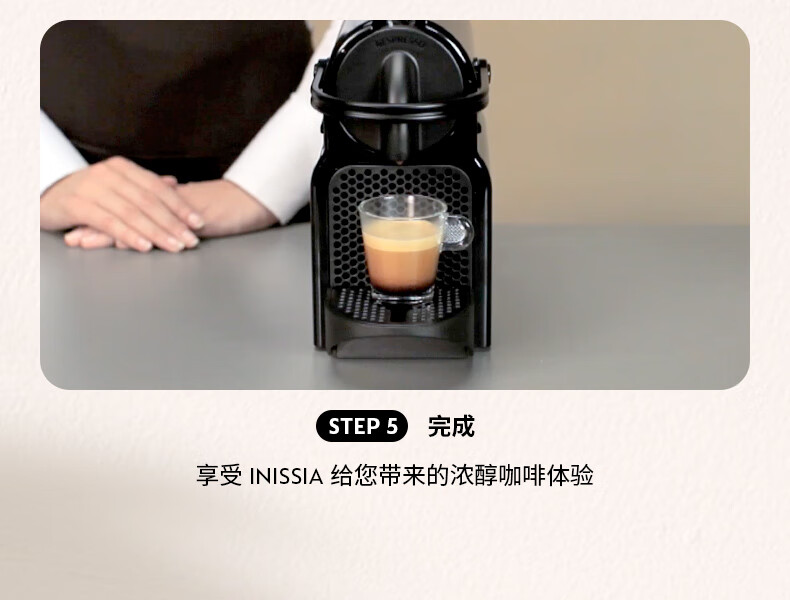 认证型号:D40 电源线长:1.2m 额定电压:220V 额定功率:1500W 产品尺寸:长321mm 宽120mm 高230mm 水箱容量:0.6-1.29L 泵浦压力:19Bar 制作口味:卡布奇诺 拿铁 意式浓缩 19Bar高压萃取系统为完整释放与呈现咖啡中的芬芳而设计;快速预热系统能在25秒内达到理想萃取温度结合NESPRESSO稳定的19Bar高压萃取技术感受INISSIA为您带来的柔滑浓郁油脂
